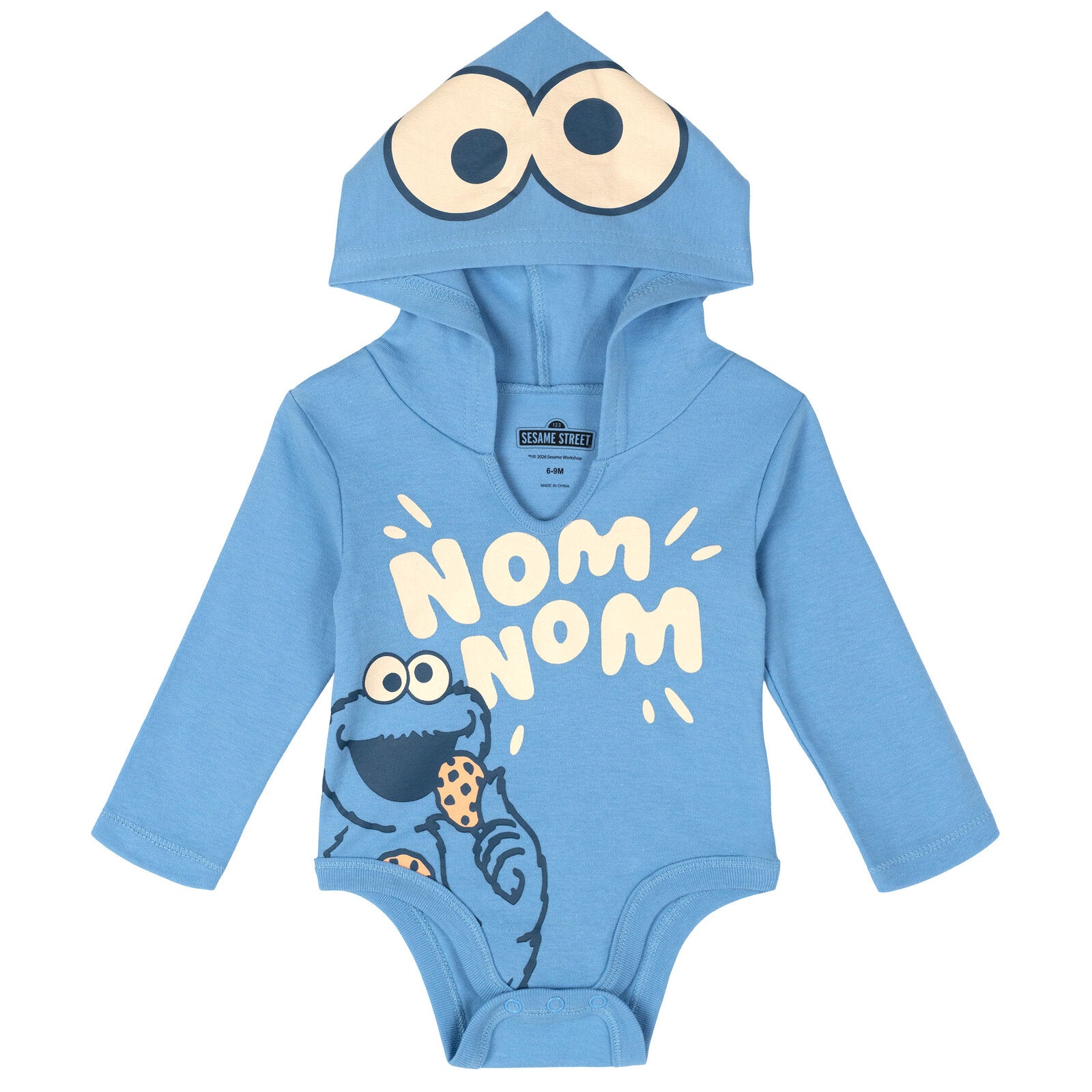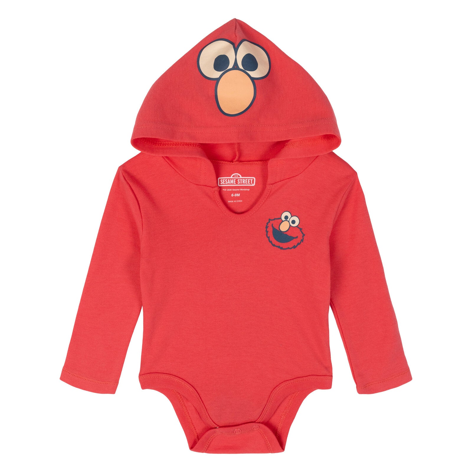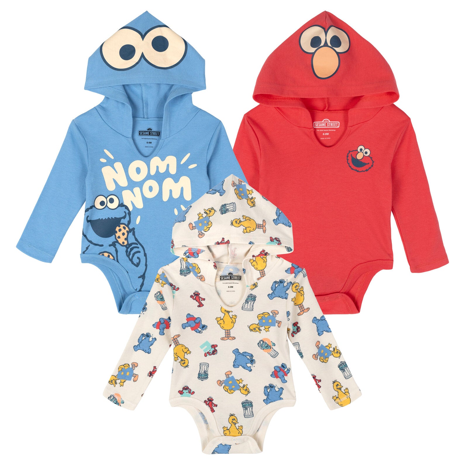 Introduce your little one to the magic of Sesame Street with this adorable 3 pack of hooded cosplay bodysuits featuring Elmo, Cookie Monster, Oscar the Grouch and Big Bird. Made for newborns to infants, these cozy and cute outfits are perfect for playtime and bedtime. Each long sleeve creeper is designed with soft and breathable fabric to keep your baby comfortable all day long. Whether your baby is a fan of Elmo's contagious laughter, Cookie Monster's love for cookies, or Big Bird's cheerful personality, they are sure to look irresistibly cute in these hooded bodysuits. Add a touch of fun and nostalgia to your baby's wardrobe with these iconic characters.