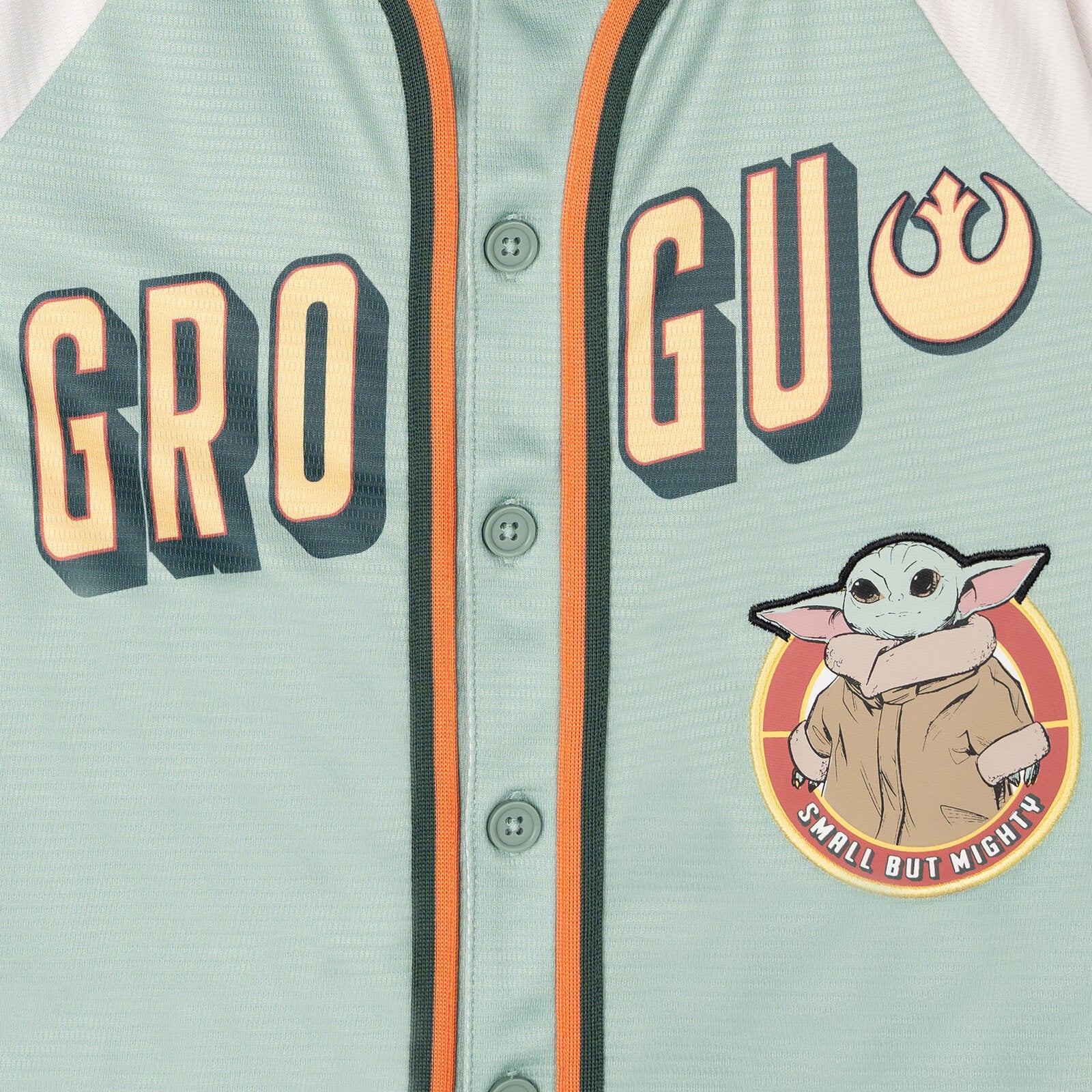 Get your little Star Wars fan ready to join the Mandalorian on their next adventure with this Mandalorian and Grogu mesh baseball jersey. This athletic V-neck raglan button down shirt is perfect for toddlers to big kids who want to show off their love for the galaxy far, far away in style. Made with breathable mesh fabric, this jersey is both comfortable and cool, making it ideal for playtime or casual outings. The vibrant colors and bold design are sure to make your child stand out, while the durable construction ensures it will last through all their galactic escapades. Get your hands on this must-have piece for any young Jedi or Sith in training.