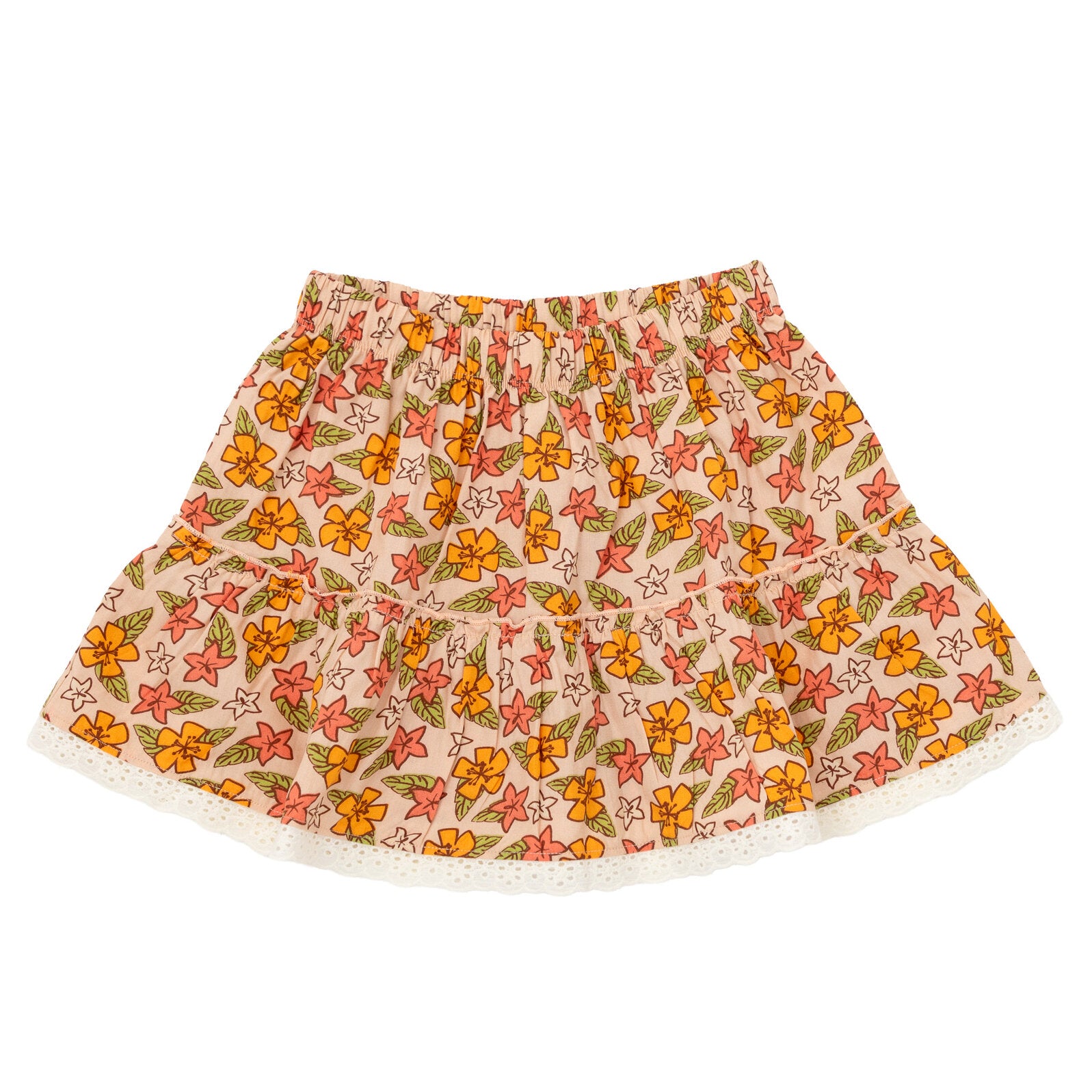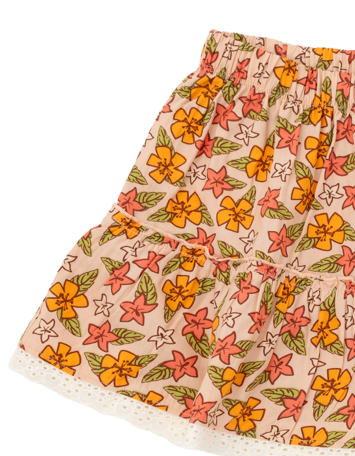 • All over print floral design; Pull on closure; Rib knit crew neck collar; Ribbed sleeve cuffs for a better fit; Water-based soft hand screen print design with embroidery art; Elastic waist for comfortable stretch and a better fit; Fashionable tiered ruffle hem; Lace overlay on shirt and lace trim on skirt