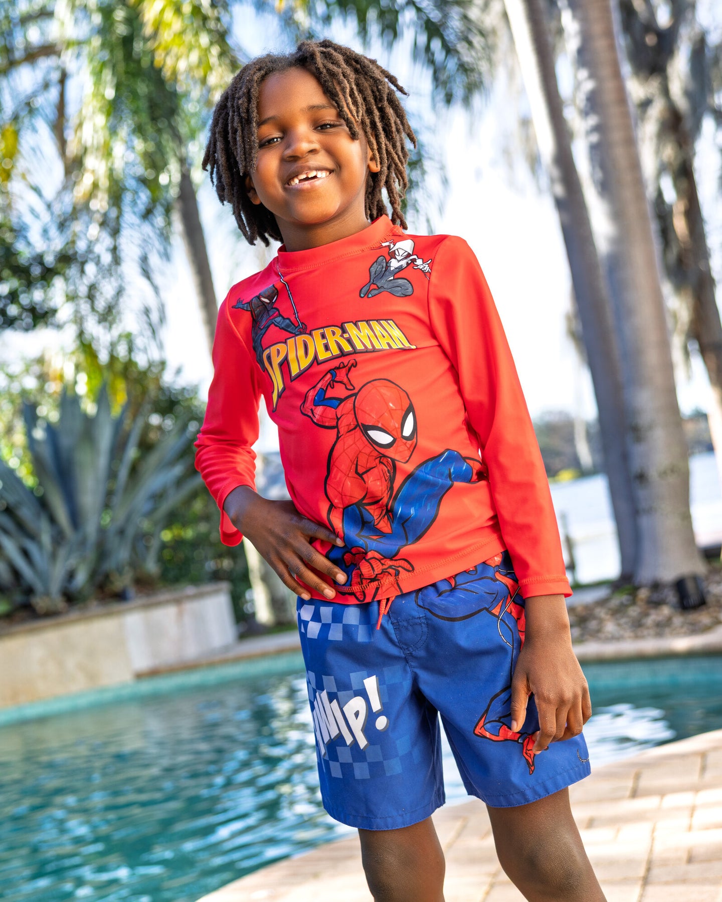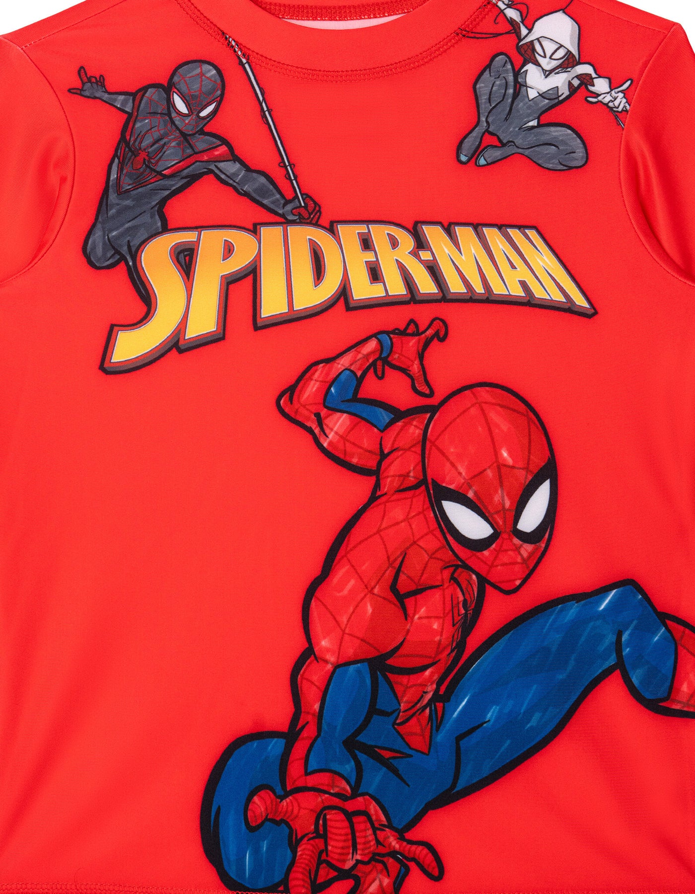 • Officially licensed Marvel Spider-Man Miles Morales Ghost-Spider toddler boys long sleeve swim shirt top and swimming shorts bottoms