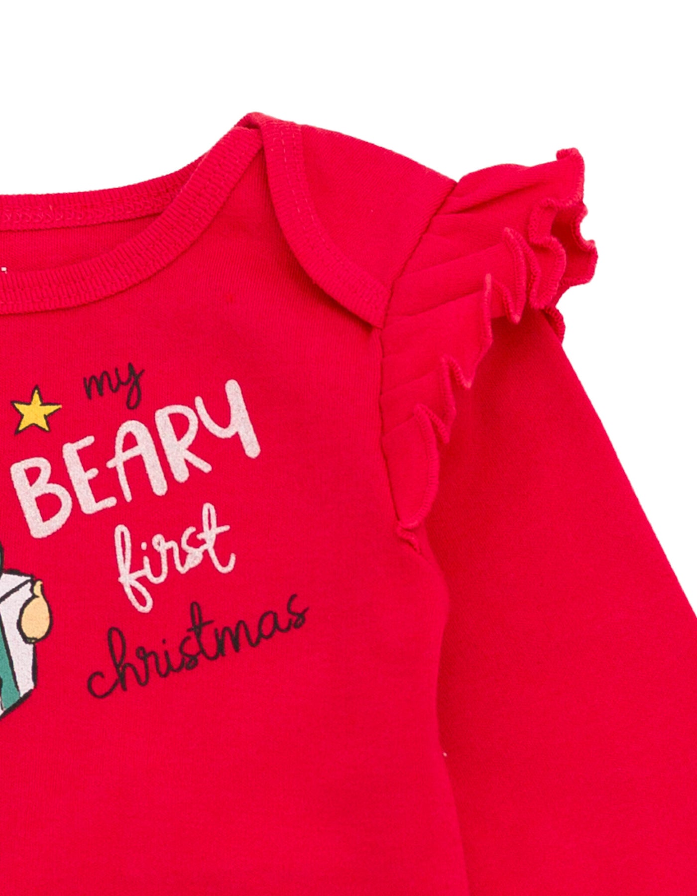 • Vibrant screen print "My Beary First Christmas" design with glitter details; All over print design; Bodysuit with rib knit binding; Lap shoulders for easy dressing; 3-snap closure for quick and easy diaper changes; Rib knit crew neck collar; Ruffled trim; Elastic waist for comfortable stretch and a better fit; 3D Bow; Screen printed applique; Elastic knotted headband