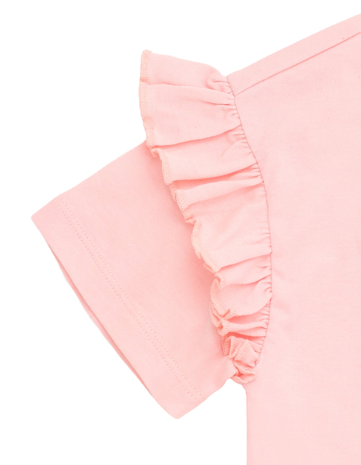 - Fashionable ruffle sleeves; Rib knit crew neck collar; Awesome screen print design; Fun and fashionable glitter design; Pull on closure