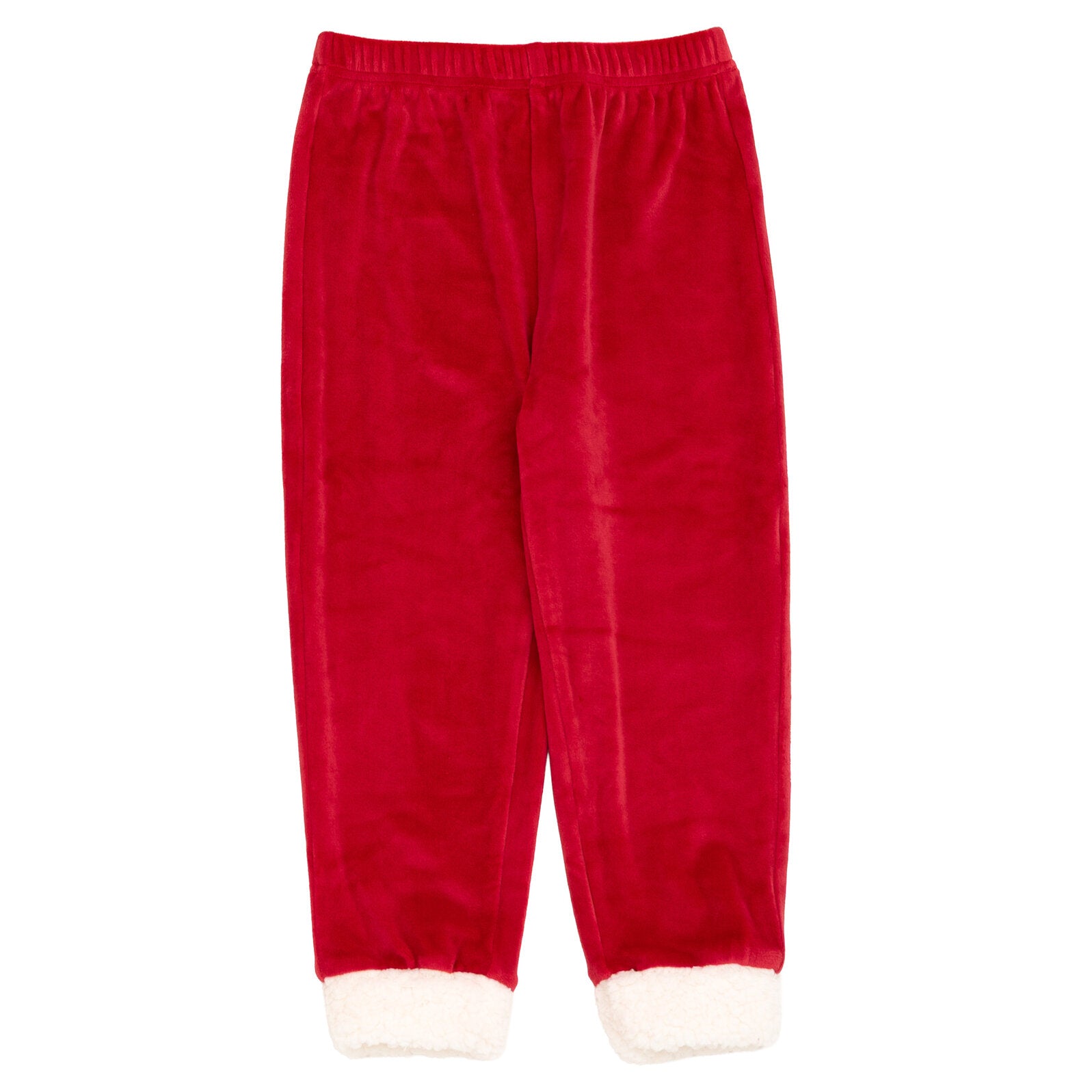 • Soft velour for a stylish and comfy look; Awesome embroidery art and faux belt applique art; Soft faux-shearling trim; Jogger style sweatpants with ankle cuffs for a better fit; Rib knit crew neck collar; Back snap buttons for easy dressing; Elastic waist for comfortable stretch and a better fit; Pull on closure; Santa hat with 3D pom pom for extra style