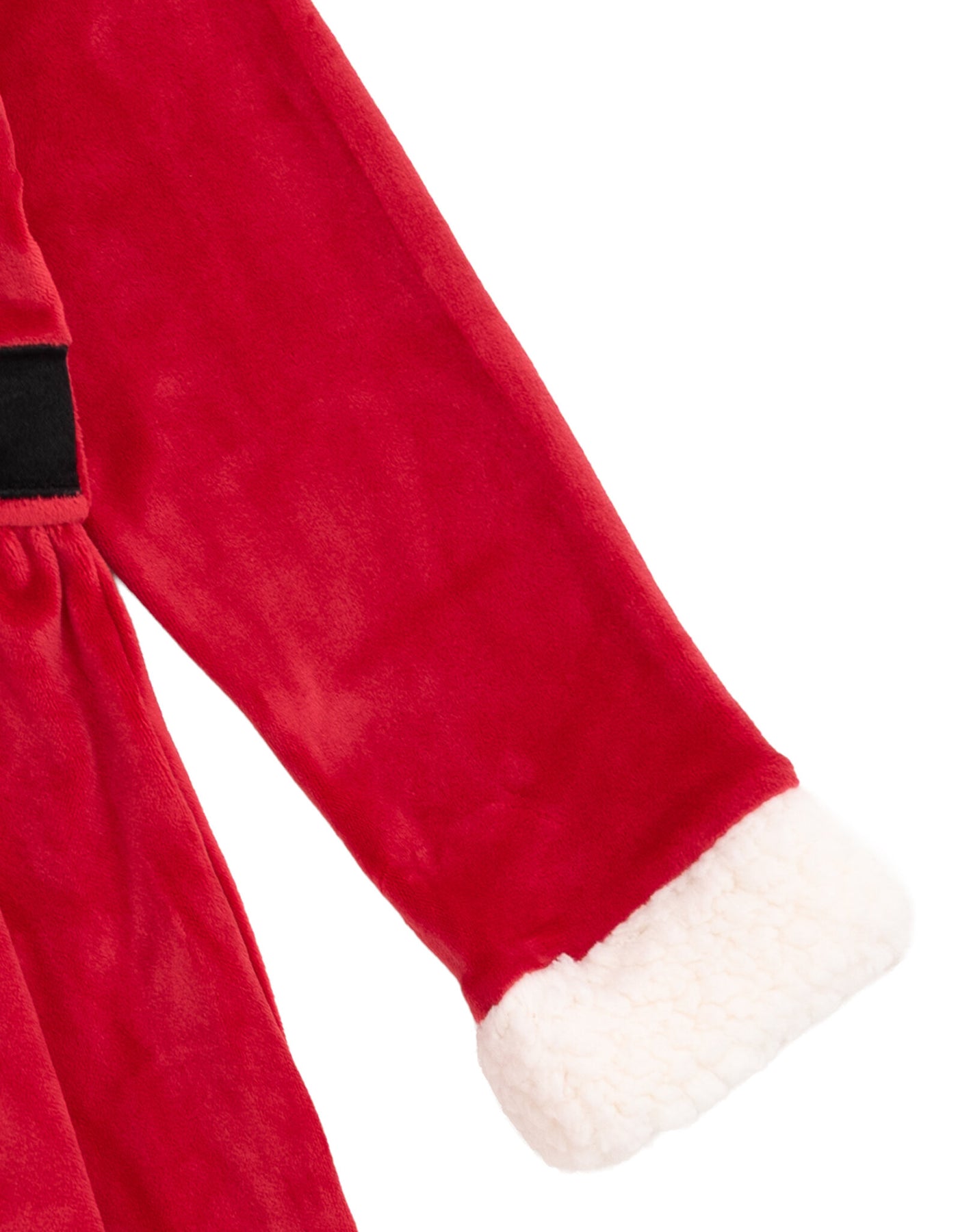 • Soft velour for a stylish and comfy look; Rib knit crew neck collar; Back snap buttons for easy dressing; Awesome embroidery art and faux belt applique art; Soft faux-shearling trim; Santa hat with 3D pom pom for extra style