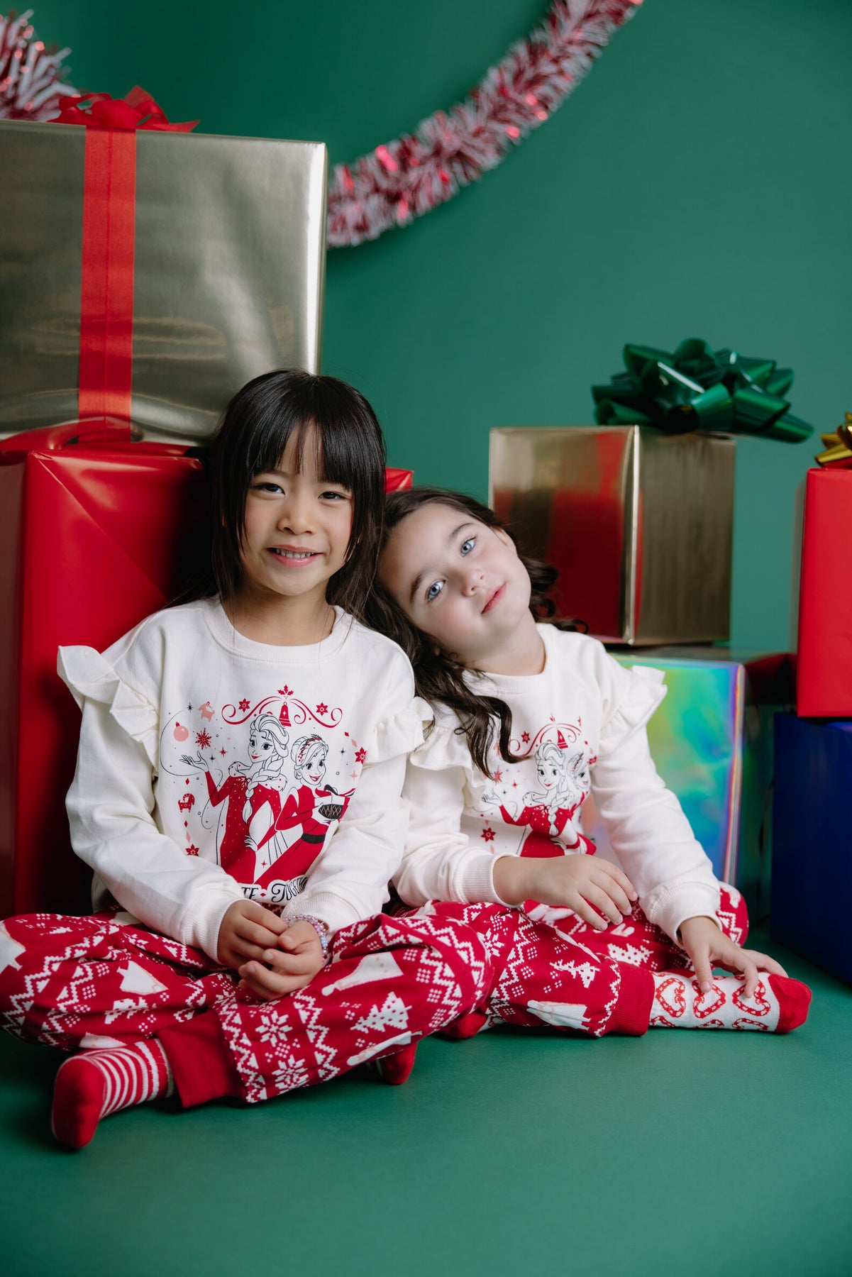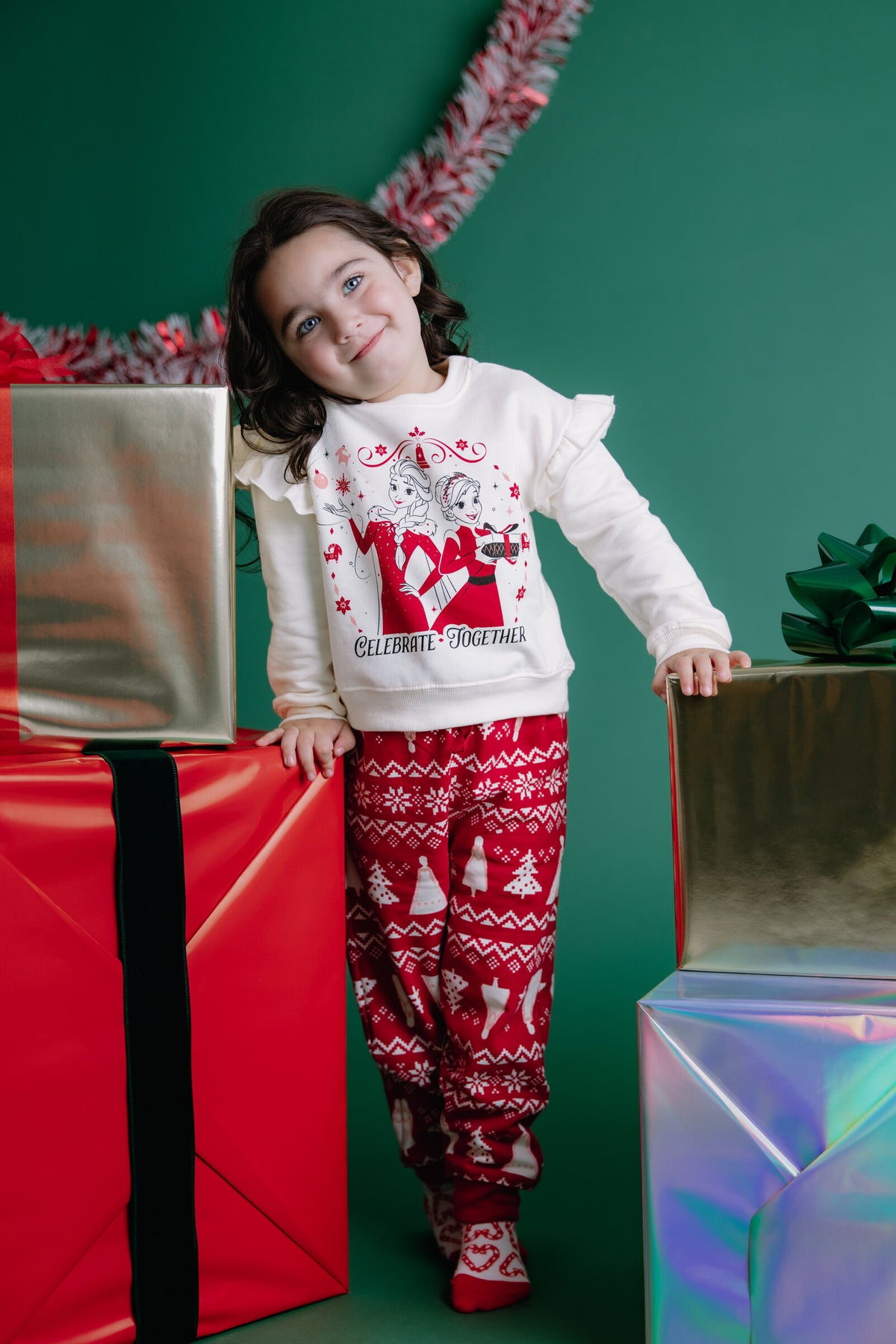Get your little princess ready for the holiday season with this adorable Disney Frozen Elsa and Anna Christmas outfit set. The set includes a cozy fleece pullover sweatshirt and matching jogger pants, perfect for keeping her warm and stylish. Featuring her favorite characters from the hit movie, this outfit is sure to be a hit with any Frozen fan. Available in sizes for toddlers to big kids, this outfit is perfect for any age. Don't miss out on this must-have holiday outfit for your little one.