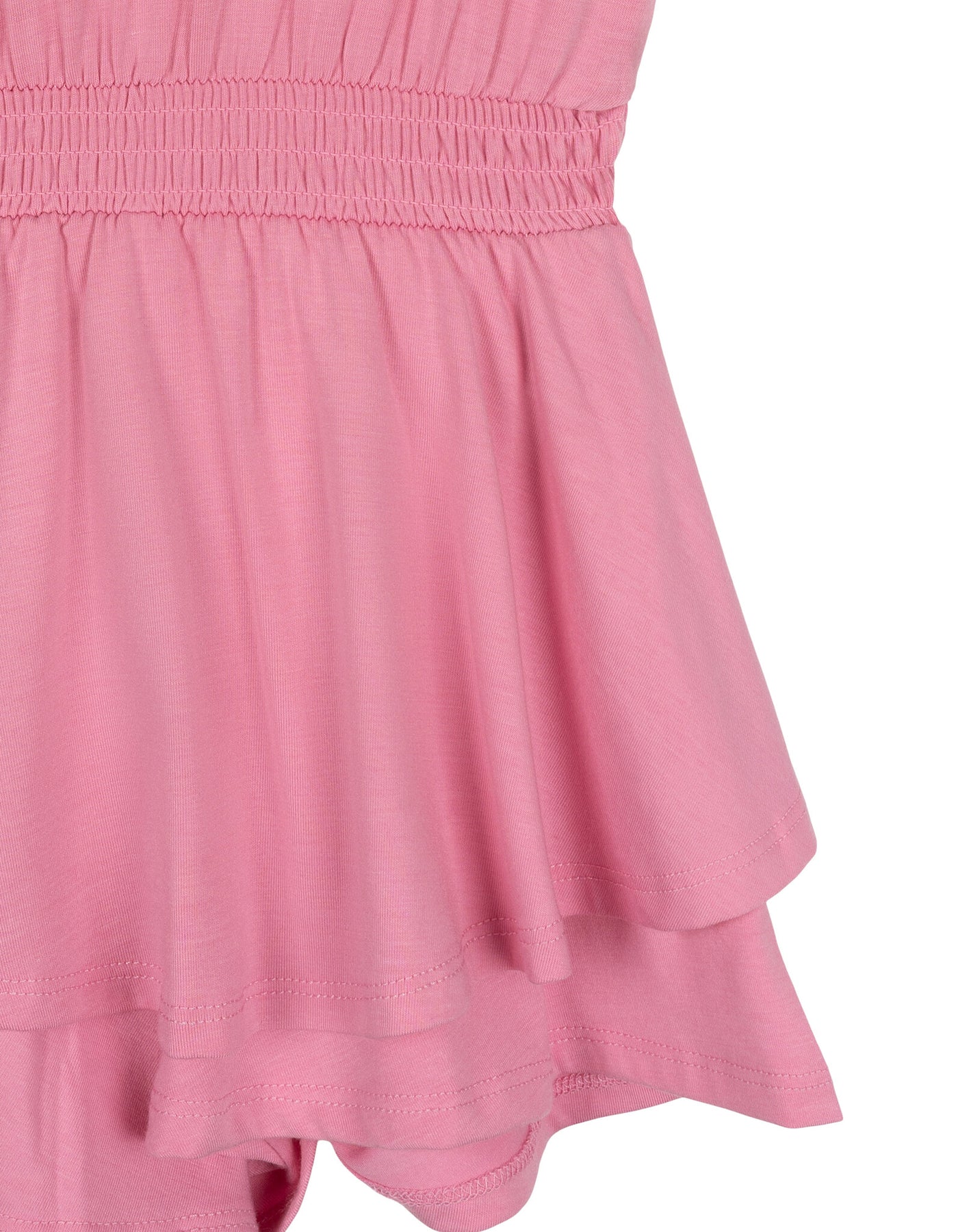 - Soft hand screen print artwork; Picot edge trim; Pull on closure; Skirt overlay for a cute and stylish look; Fashionable smocked waist; Round neckline