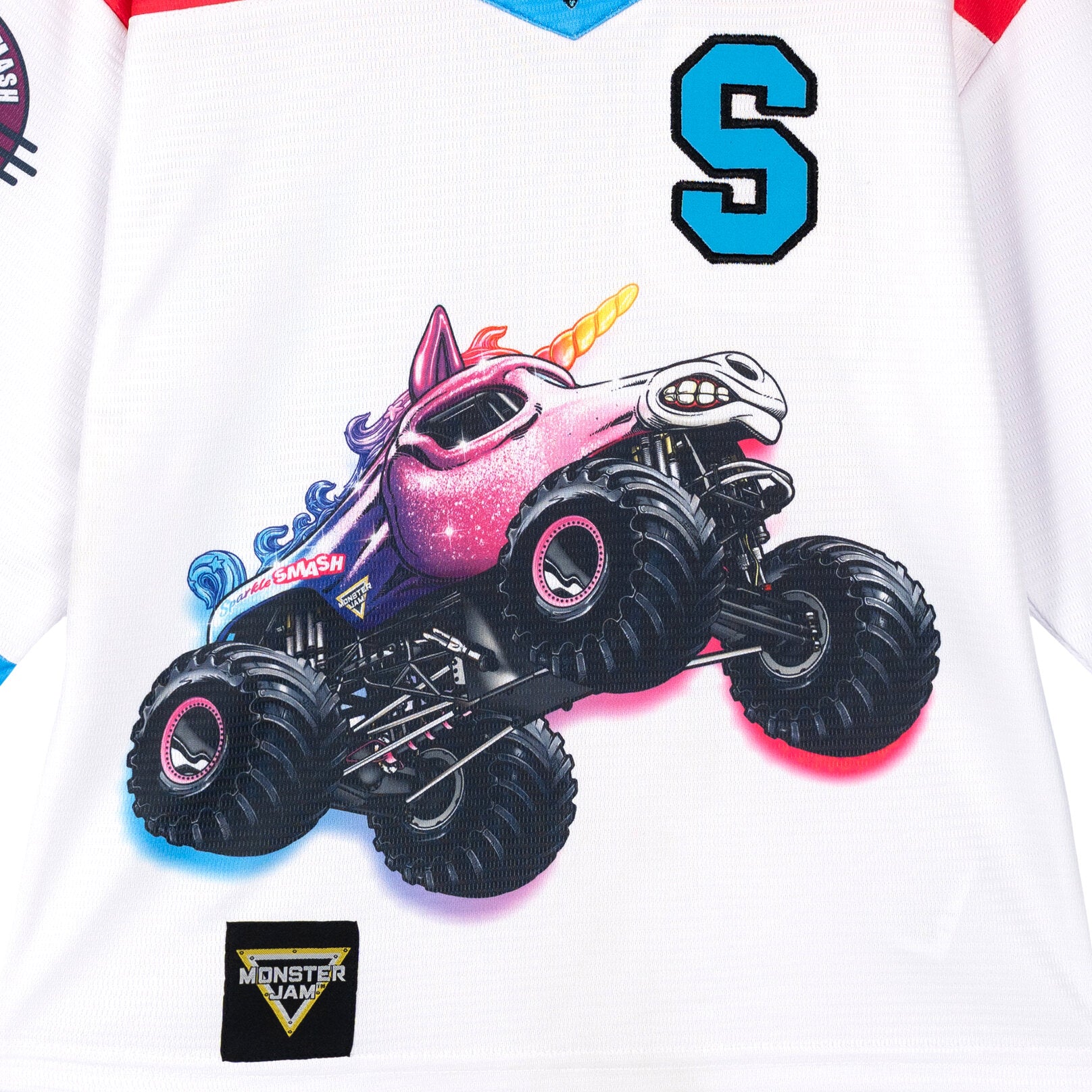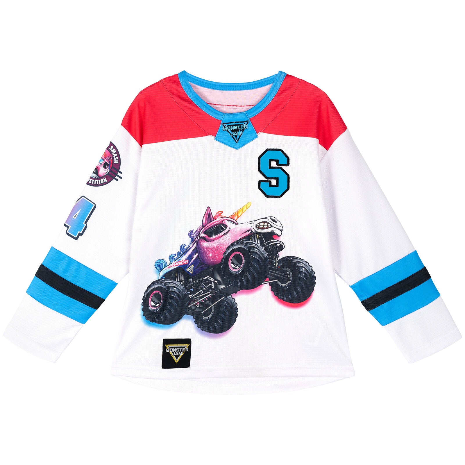 Ready?Set?Go! Jump into the action-packed world of Monster Jam, where the competition is fierce, the stunts are epic, and the trucks are giant. Your monster truck enthusiast is ready for adventure in this cool Monster Jam hockey jersey. This stylish long sleeve hockey shirt features bold colors, a fun sports jersey design, and vibrant Sparkle Smash artwork that your little girl will be excited to wear. Made of a soft and lightweight mesh material for lasting comfort, this fashionable Monster Jam athletic tee is perfect for sports, play, and everyday wear.