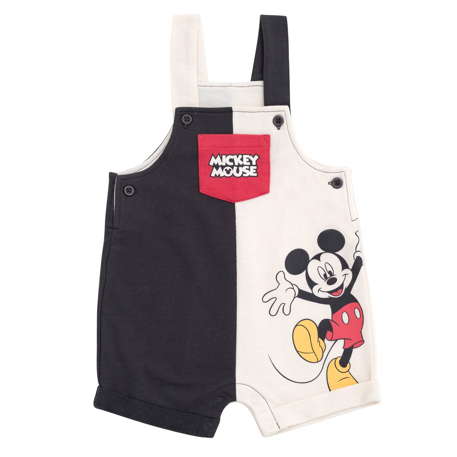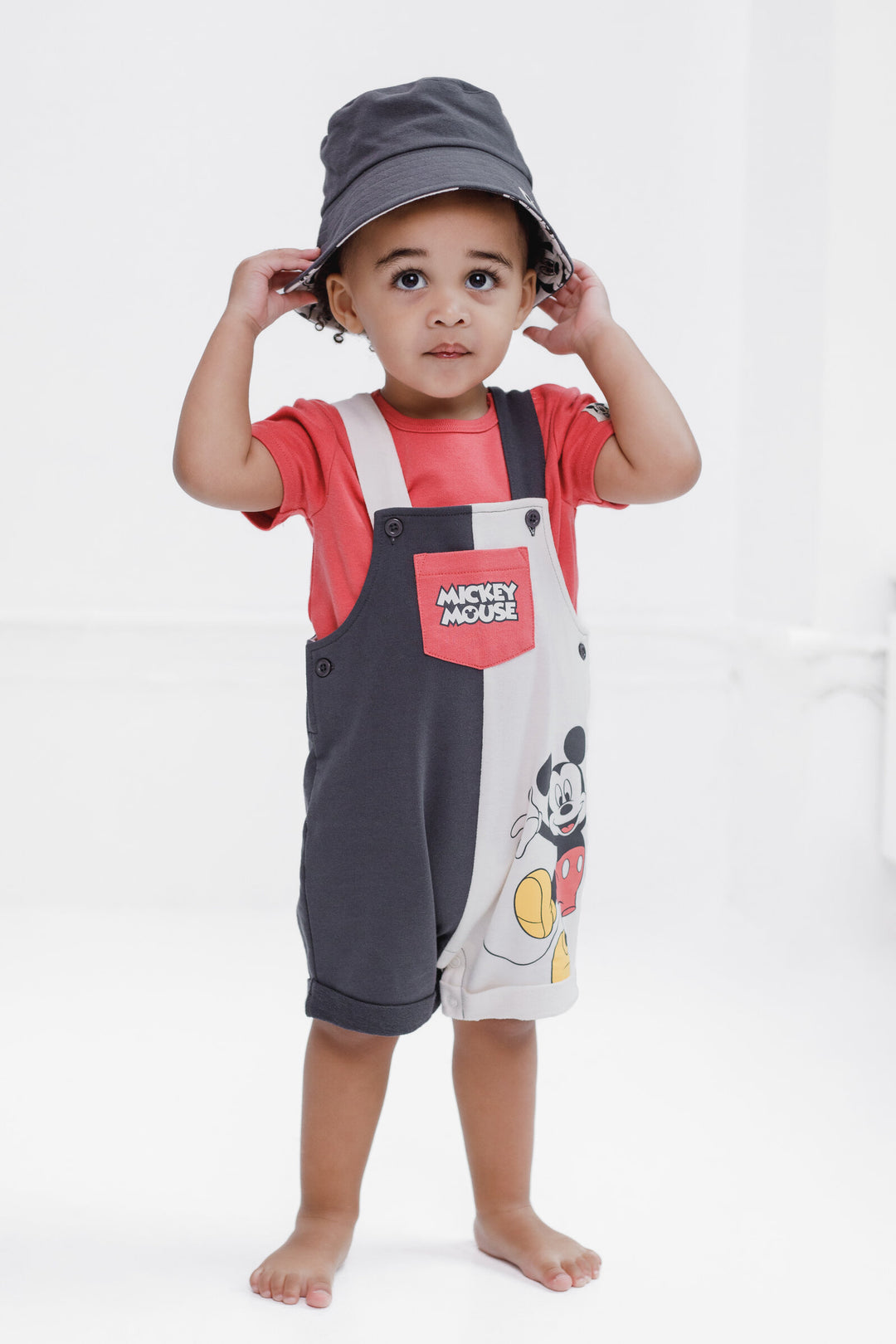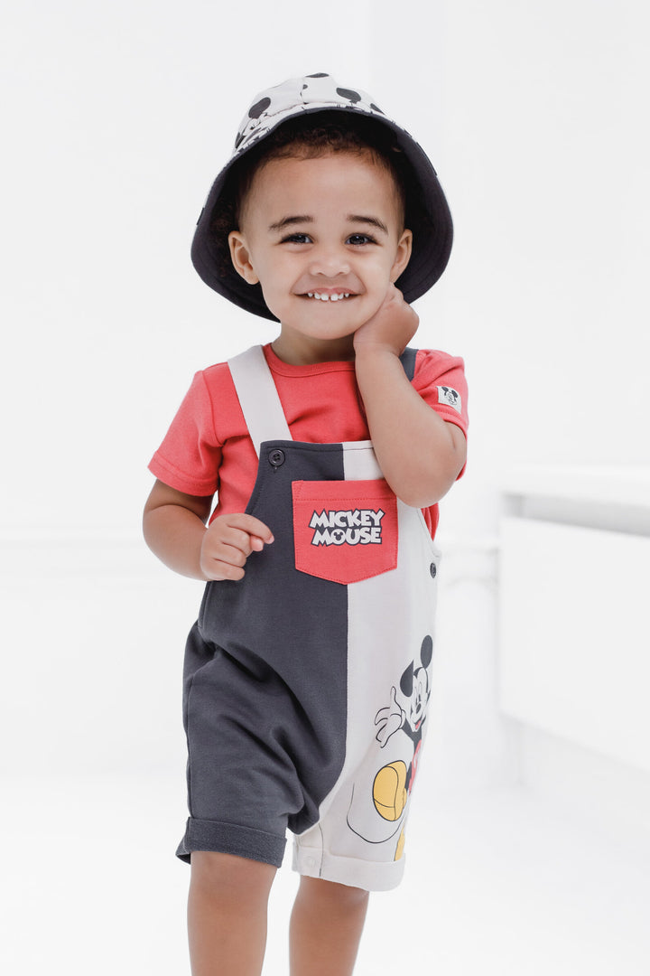 Disney Mickey Mouse French Terry Square Neck Short Overalls, T-Shirt and Bucket Sun Hat 3 Piece Outfit Set