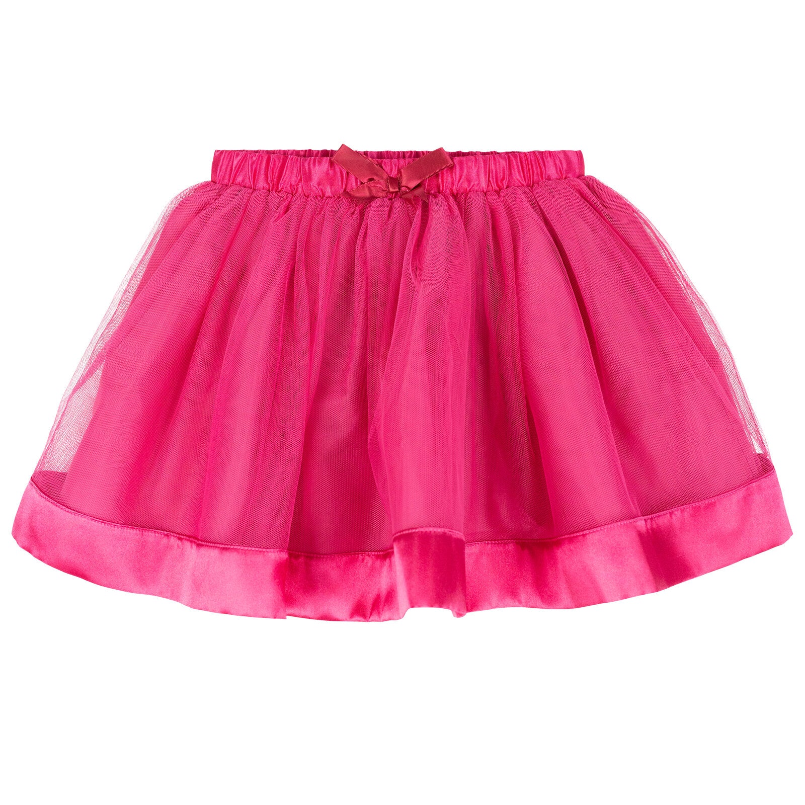 • Tulle skirt with satin hem and taffeta lining; 3D satin bow at waist; Rib knit crew neck collar; Soft hand screen print artwork; Elastic waist for comfortable stretch and a better fit; Pull on closure