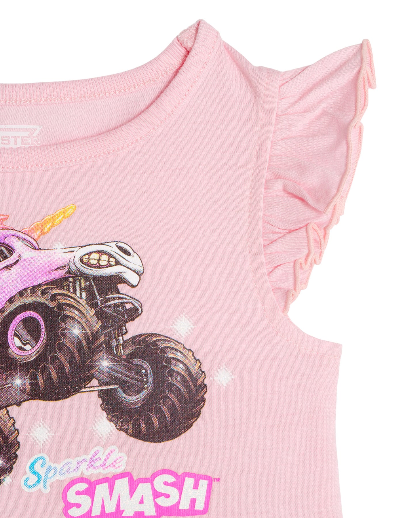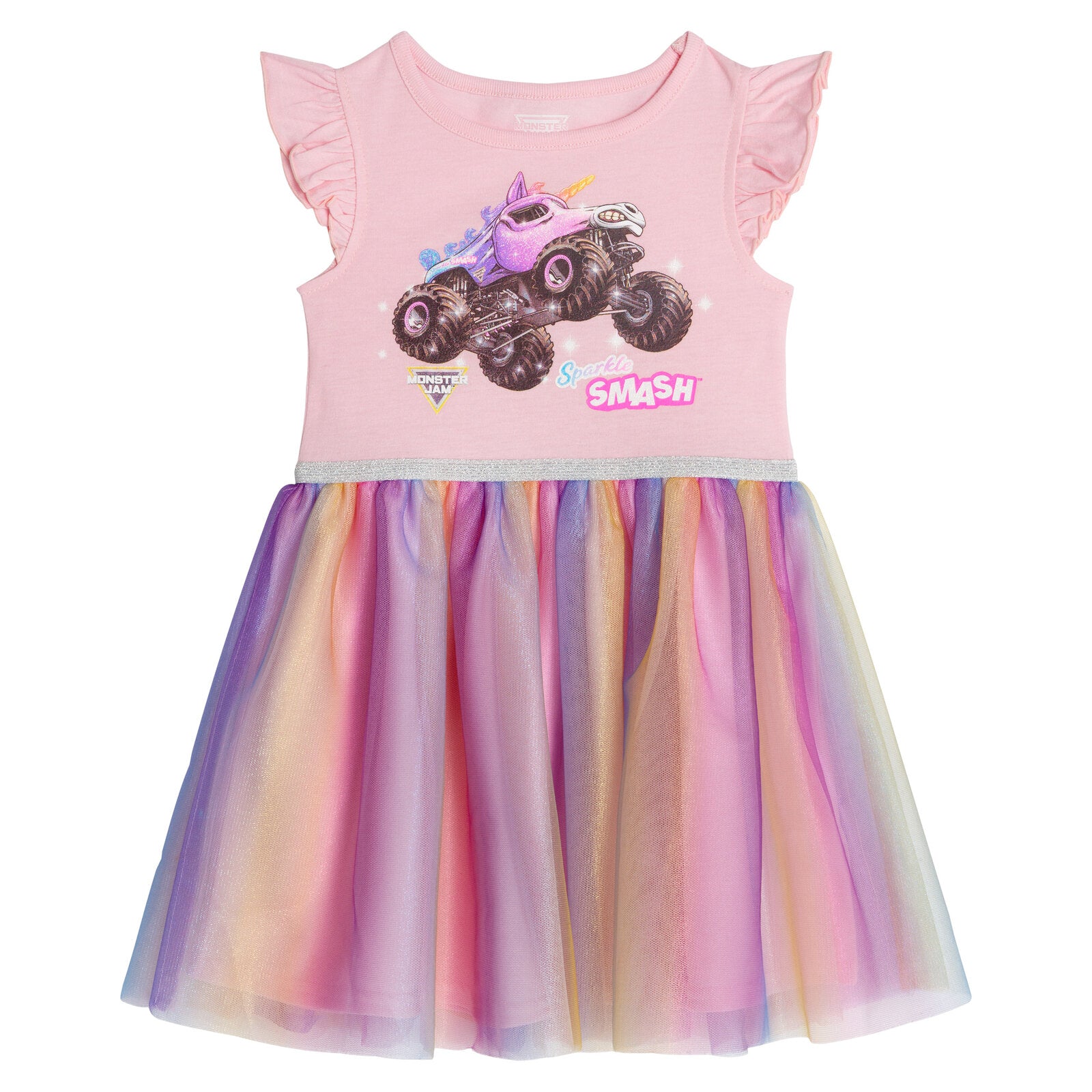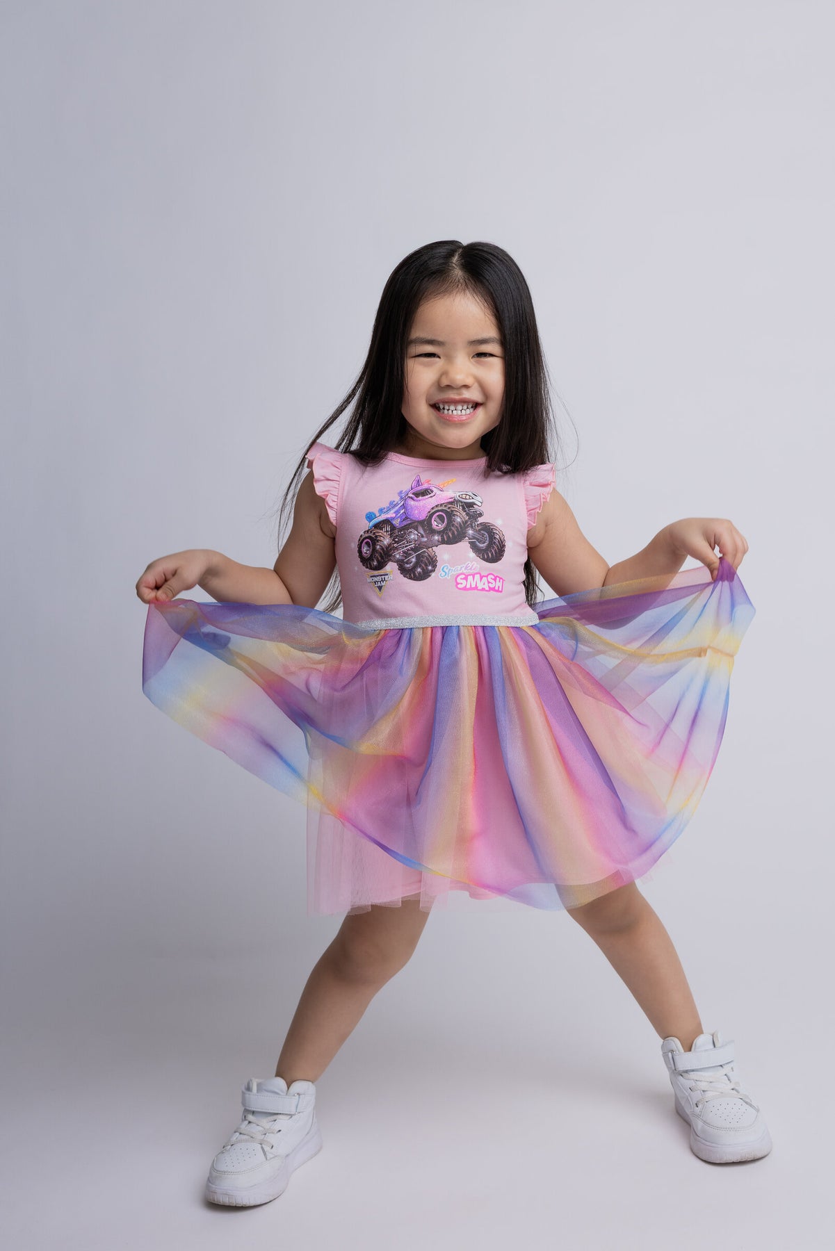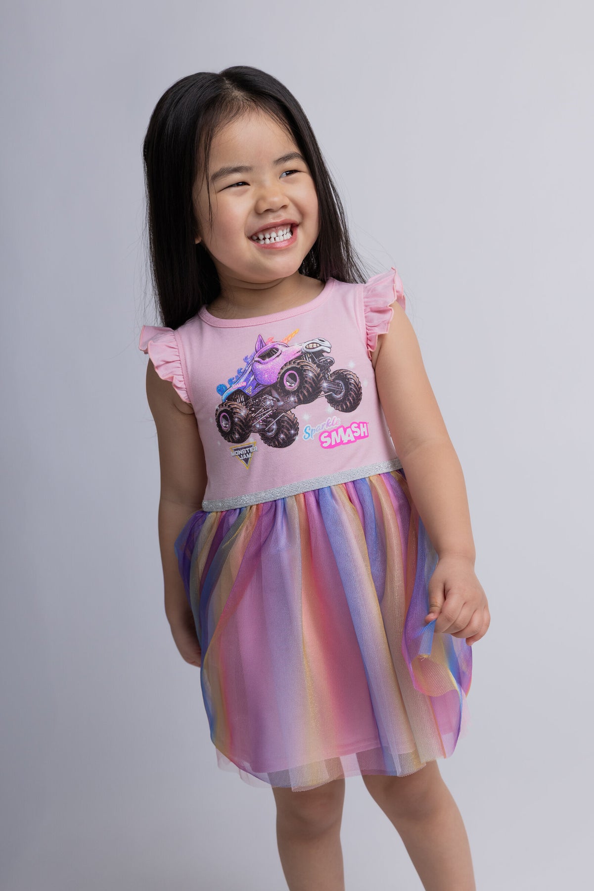 Ready?Set?Go! Jump into the action-packed world of Monster Jam, where the competition is fierce, the stunts are epic, and the trucks are giant. Your little girl is ready for adventure with her favorite monster truck in this cool Monster Jam tutu dress! This stylish flutter sleeve dress features bold colors and vibrant Sparkle Smash artwork that she will be excited to wear! Made of a soft material for all day comfort, this fashionable outfit is perfect for any Monster Jam fan!
