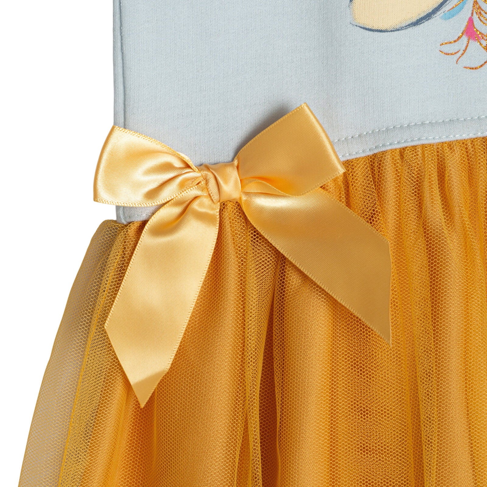 - Pleated tulle skirt; Rib knit crew neck collar; Soft hand screen print artwork with glitter; Stylish drop shoulder cap sleeves; Pull on closure; 3D satin bows at waist