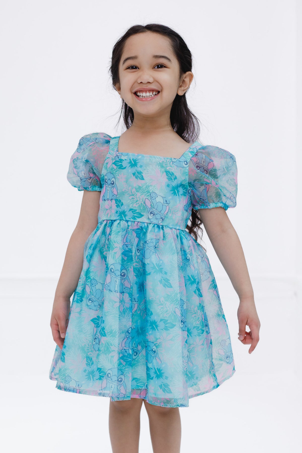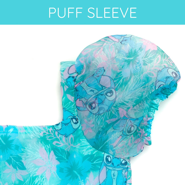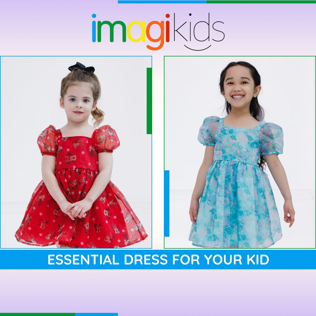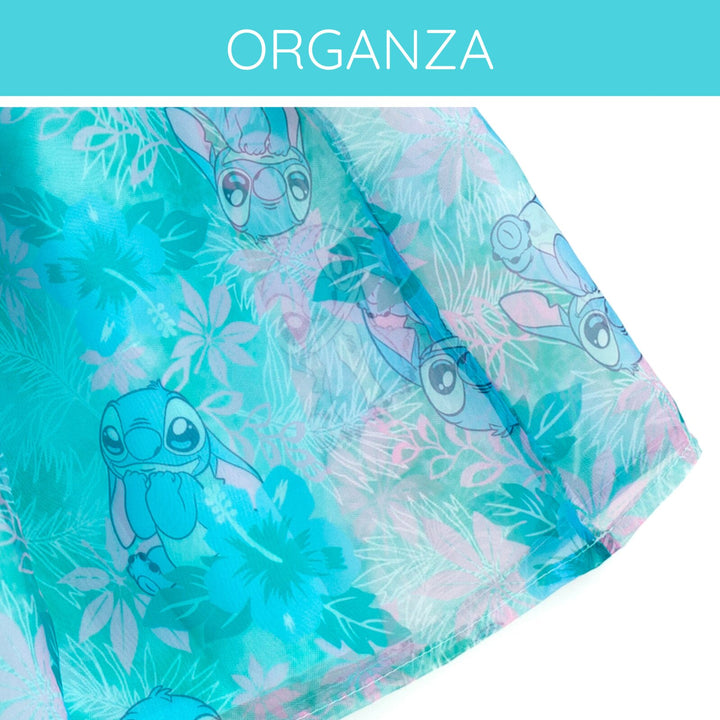 Get ready for a day filled with Disney magic in this cute Disney organza dress! This stylish short sleeve dress features a square neck design, comfy pleated skirt, pretty puffed sleeves, and vibrant all-over-print artwork of your little girl's favorite classic Disney characters! Choose from a red dress with a Minnie Mouse and polka dot design or a blue dress with Stitch from Lilo and Stitch and a Hawaiian flower and leaf print. Made of soft and lightweight organza for all day comfort, this fashionable Disney puff sleeve dress is perfect for a fun party outfit and cool spring and summer wear!