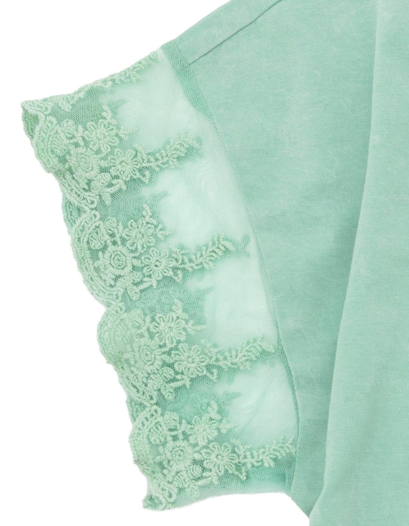 • Rib knit crew neck collar; Soft hand screen print design; Pull on closure; Sparkly and shiny rhinestone artwork; Acid wash fabric for a cool vintage look; Lace trim on sleeves