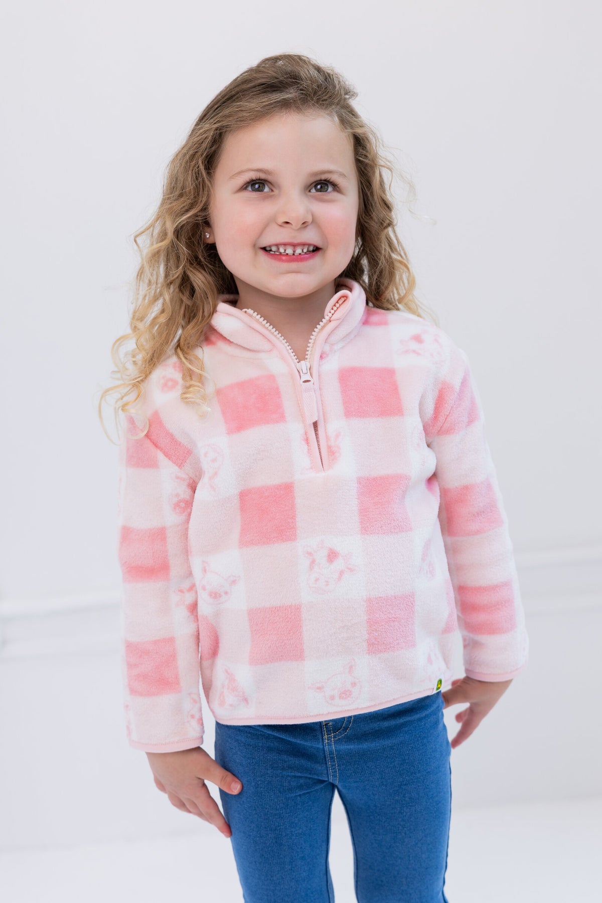 Introduce your little one to the world of John Deere with this adorable John Deere Girls Half Zip Woobie Sweatshirt for toddlers. Made with soft and cozy woobie fabric, this sweater features a cute farm animal and checkered print and the iconic John Deere logo. The half zip design allows for easy on and off, while the mock neck keeps your child warm and comfortable. Perfect for outdoor adventures or cozy days at home, this sweatshirt is a must-have for any little farm animal fan. Get yours today and watch your little girls face light up with joy.