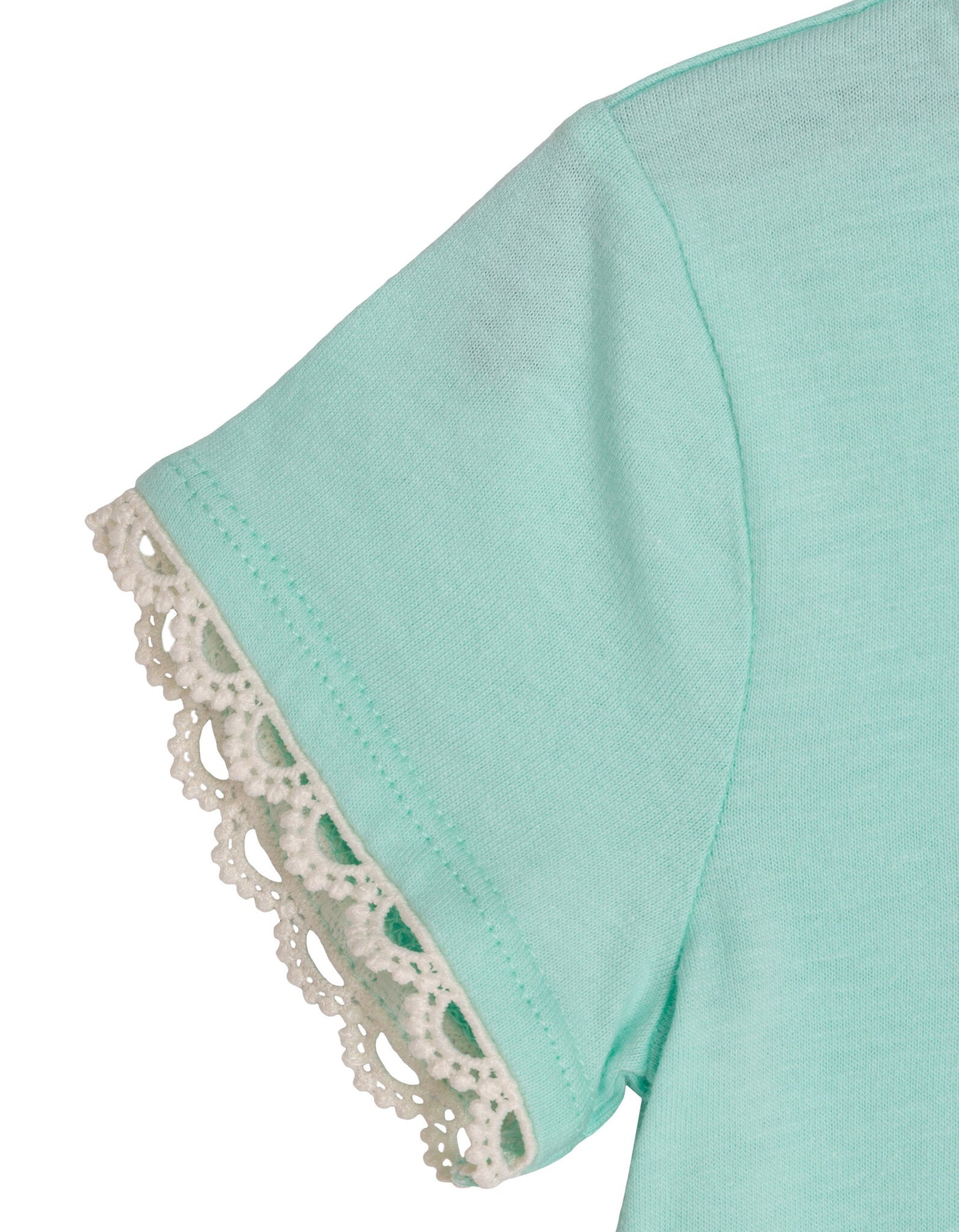 • Rib knit crew neck collar; Soft hand screen print artwork; Puffed 3D flower design; Pull on closure; Lace trim; Jacquard embroidered patch art