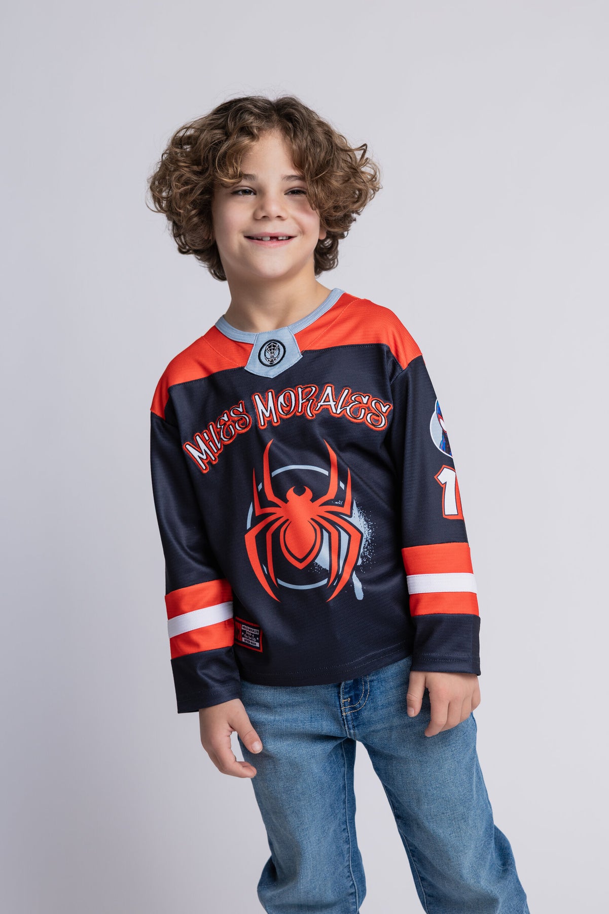Get your little superhero ready for action with this Marvel Spider-Man Miles Morales Mesh Hockey Jersey Long Sleeve T-Shirt, designed for toddlers to big kids. This officially licensed t-shirt features a unique mesh design with the iconic Spider-Man logo, perfect for any young fan of the popular Marvel comic series. Made with high-quality materials, this long-sleeve jersey offers comfort and style for all-day wear. Let your child swing into action with this stylish and fun Spider-Man t-shirt that is sure to be a hit with any young Spidey fan.