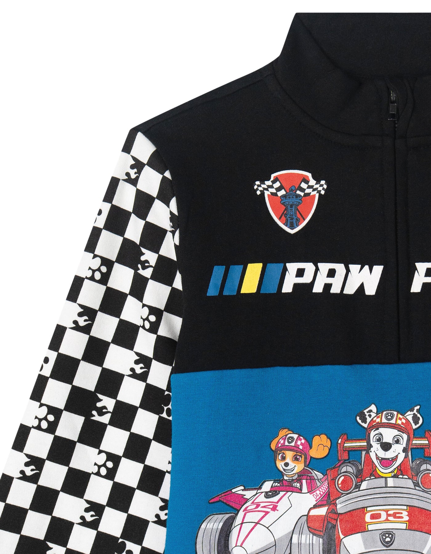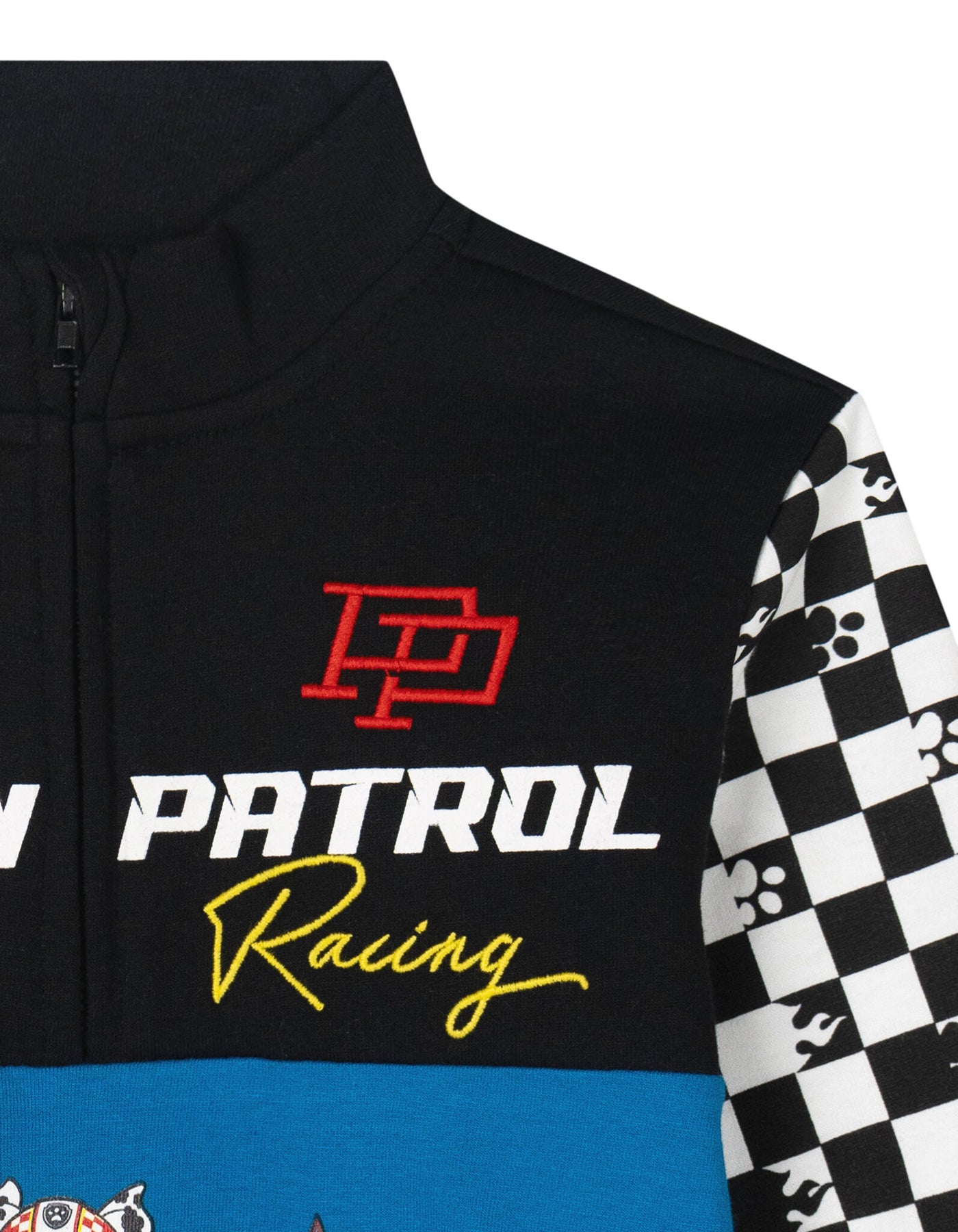 - Half zip closure for easy dressing; Ribbed sleeve cuffs and waist for a better fit; Awesome screen print design with embroidery art; Cozy mock neck style; Checkerboard sleeve art design; Color block design