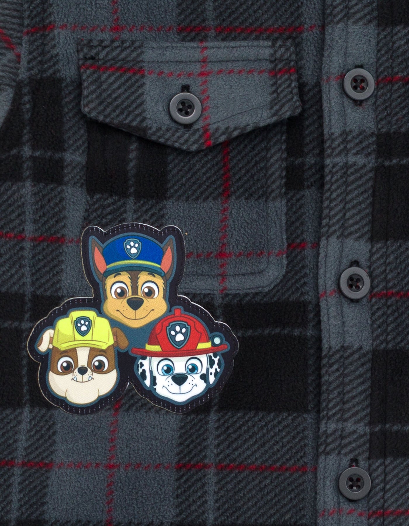 Get your little one ready for any adventure with this Paw Patrol plaid flannel shacket. Made with soft and cozy fabric, this shirt jacket is perfect for keeping your toddler warm and stylish. Featuring the beloved characters Chase, Marshall, and Rubble, this shacket is sure to be a hit with any Paw Patrol fan. The classic plaid design and collar adds a touch of timeless charm, while the button-up front provide a secure fit. Perfect for outdoor play or indoor snuggles, this shacket is a must-have for any little Paw Patrol enthusiast. Available in toddler sizes, this shacket is the perfect addition to your child's wardrobe. Order now and let your little one join the Paw Patrol team in style.