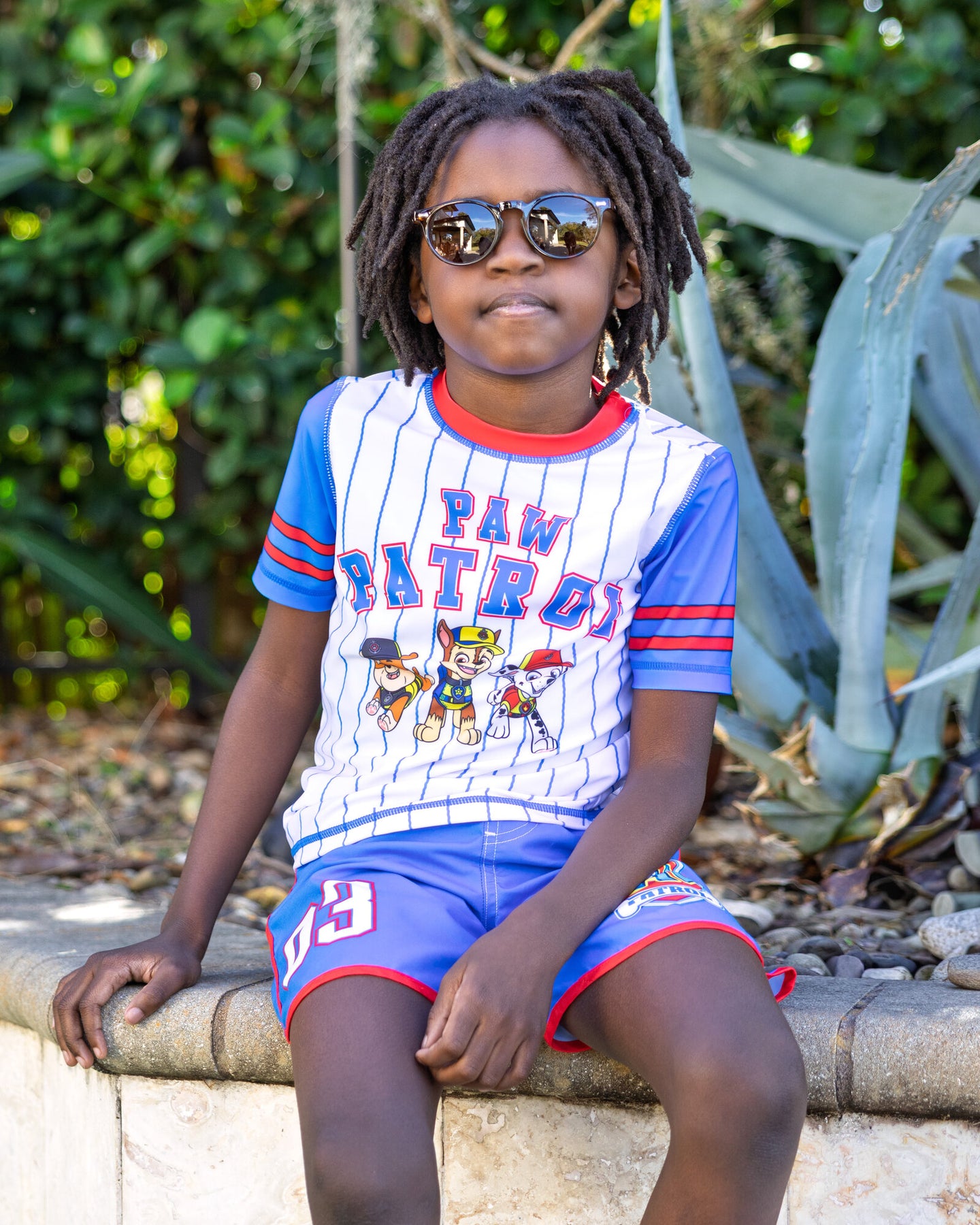 • Cool baseball sports jersey style; Contrast color sleeves; Comfy crew neck collar; Awesome sublimation print artwork; UPF 50+ material for excellent UVB and UVA sun protection and worry-free sun time; Mesh-lined swim shorts; Faux drawstring; Elastic waist for comfortable stretch and a better fit; Pull on closure; Stripe pattern design