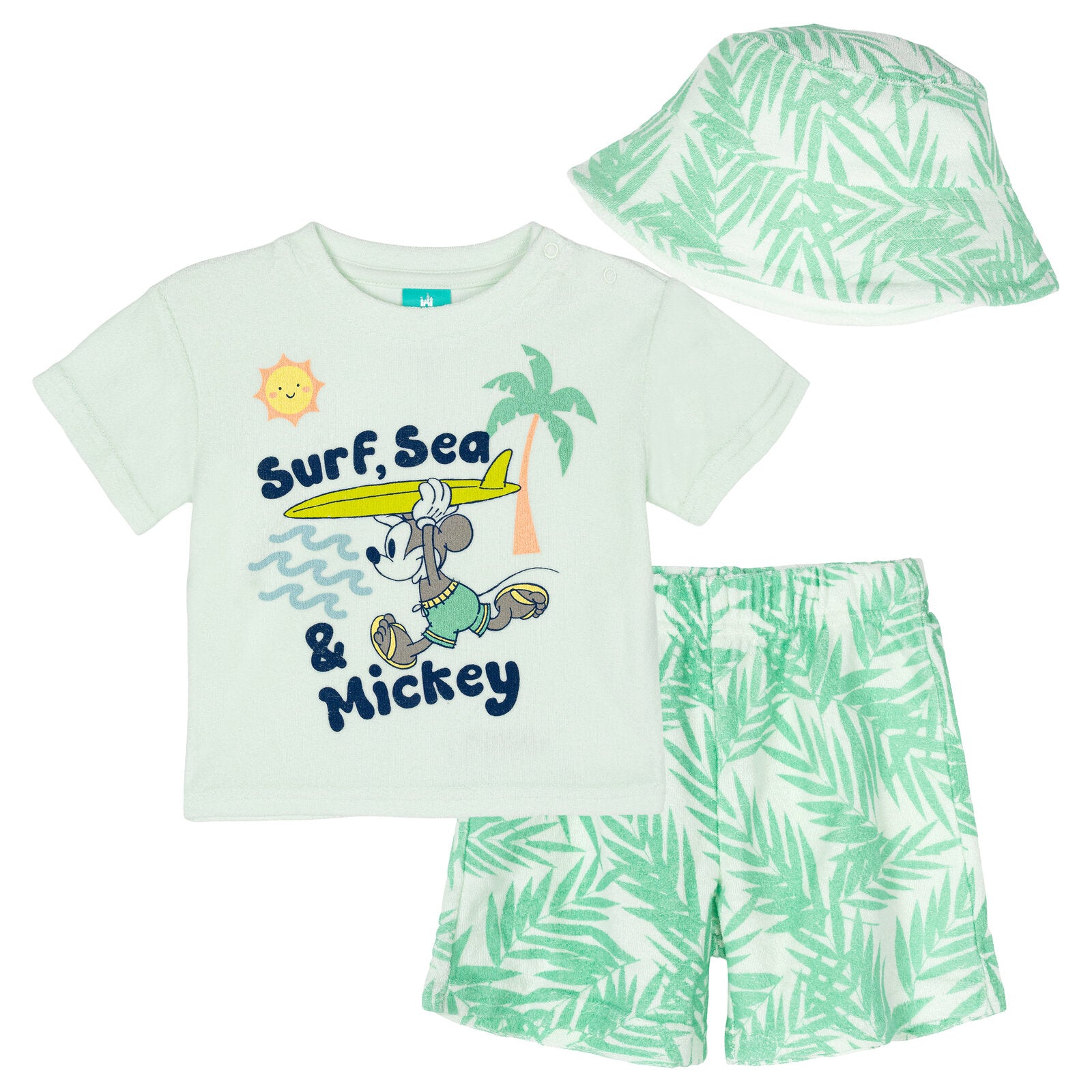 - Officially licensed Disney Mickey Mouse newborn and infant 3 piece mix n' match clothing set: short sleeve graphic tee shirt, shorts, and cap