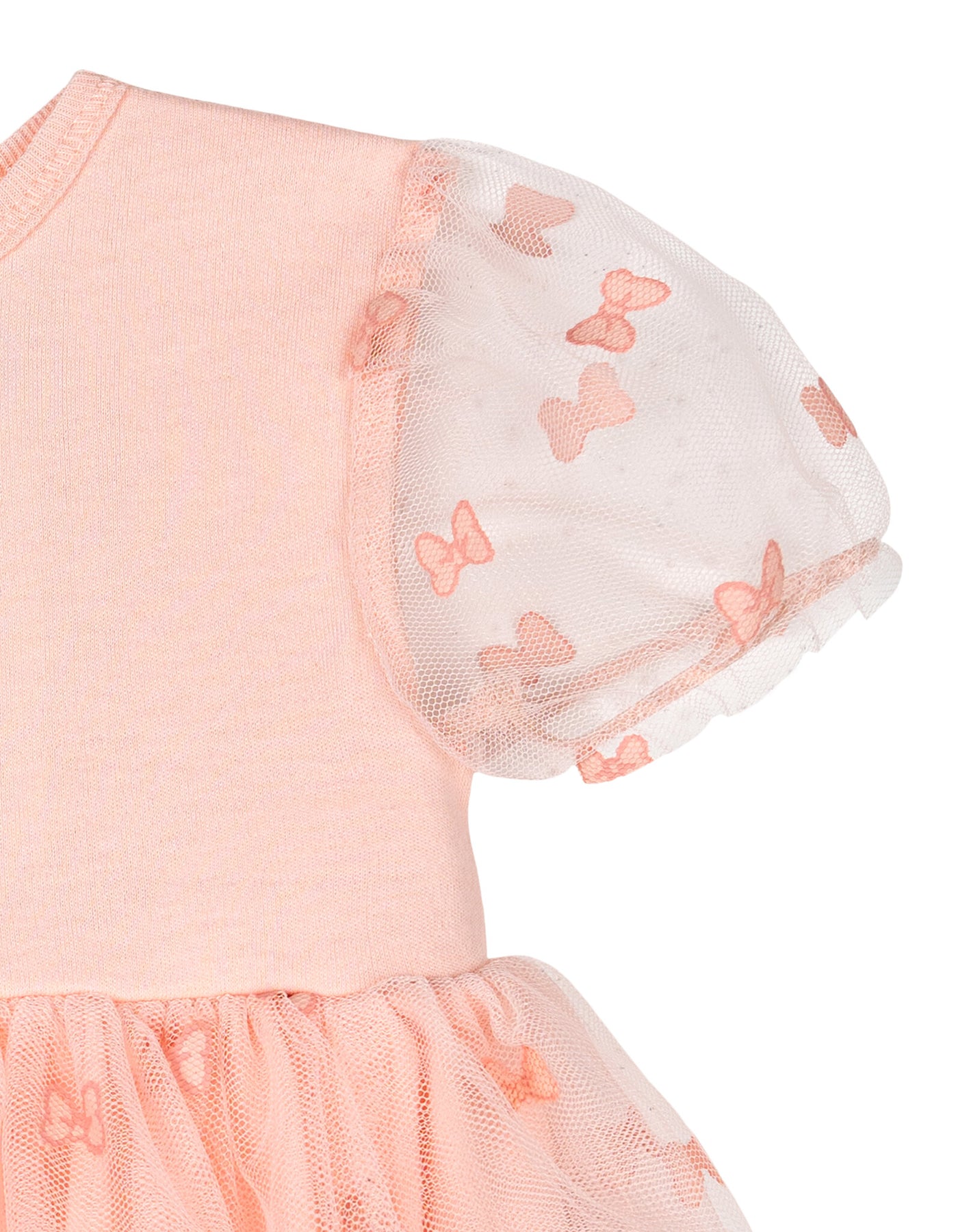 • All over print bow design; 3-snap closure for quick and easy diaper changes; Elastic bow headband; Rib knit crew neck collar; Awesome screen print artwork with embroidery; Fashion puff sleeves with elastic sleeve cuffs for a better fit; Stylish layered mesh overlay dress