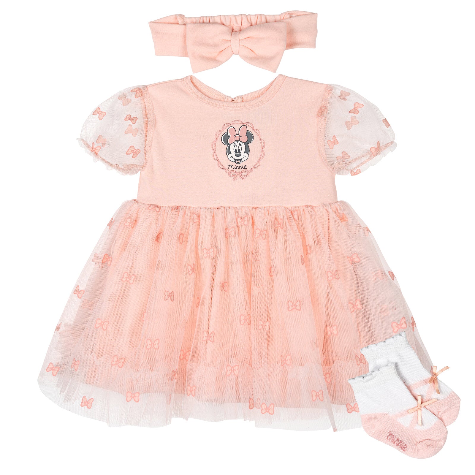 • Officially licensed Disney Minnie Mouse newborn and infant 3 piece mix n' match clothing set: short sleeve dress, head band, and socks