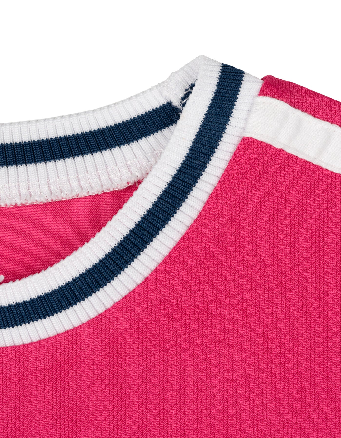 - Comfortable athletic performance material for an active lifestyle, Cool and comfy high quality fabric; Rib knit crew neck collar; Soft hand screen print artwork; Contrast stripe taping; Pull on closure; Comfy t-shirt dress for classic style and easy everyday wear