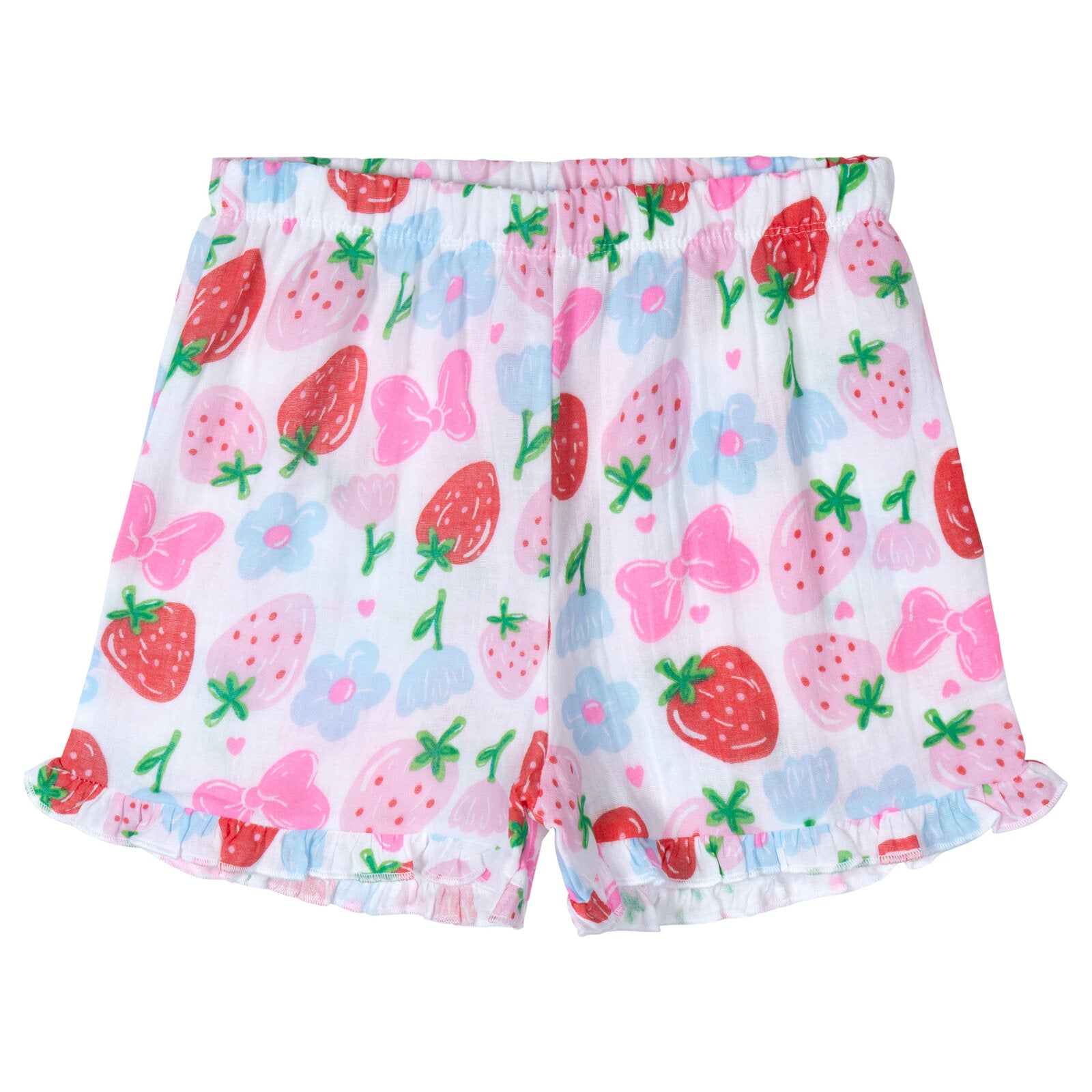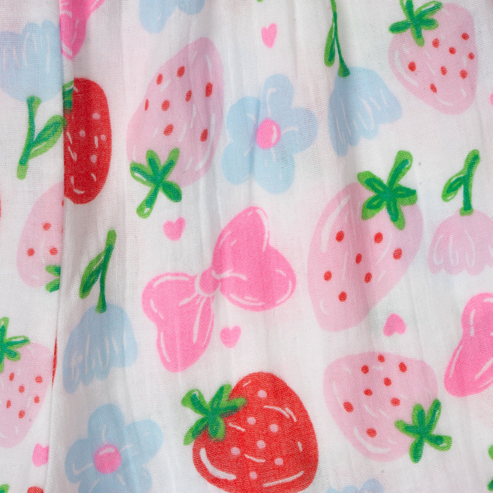 • All over print design; Fashionable ruffle sleeves; Rib knit crew neck collar; Awesome screen print artwork with the words "So Berry Cute"; Elastic waist for comfortable stretch and a better fit; Pull on closure; Ruffled trim; Comfortable and lightweight cotton gauze fabric that is perfect for the summer