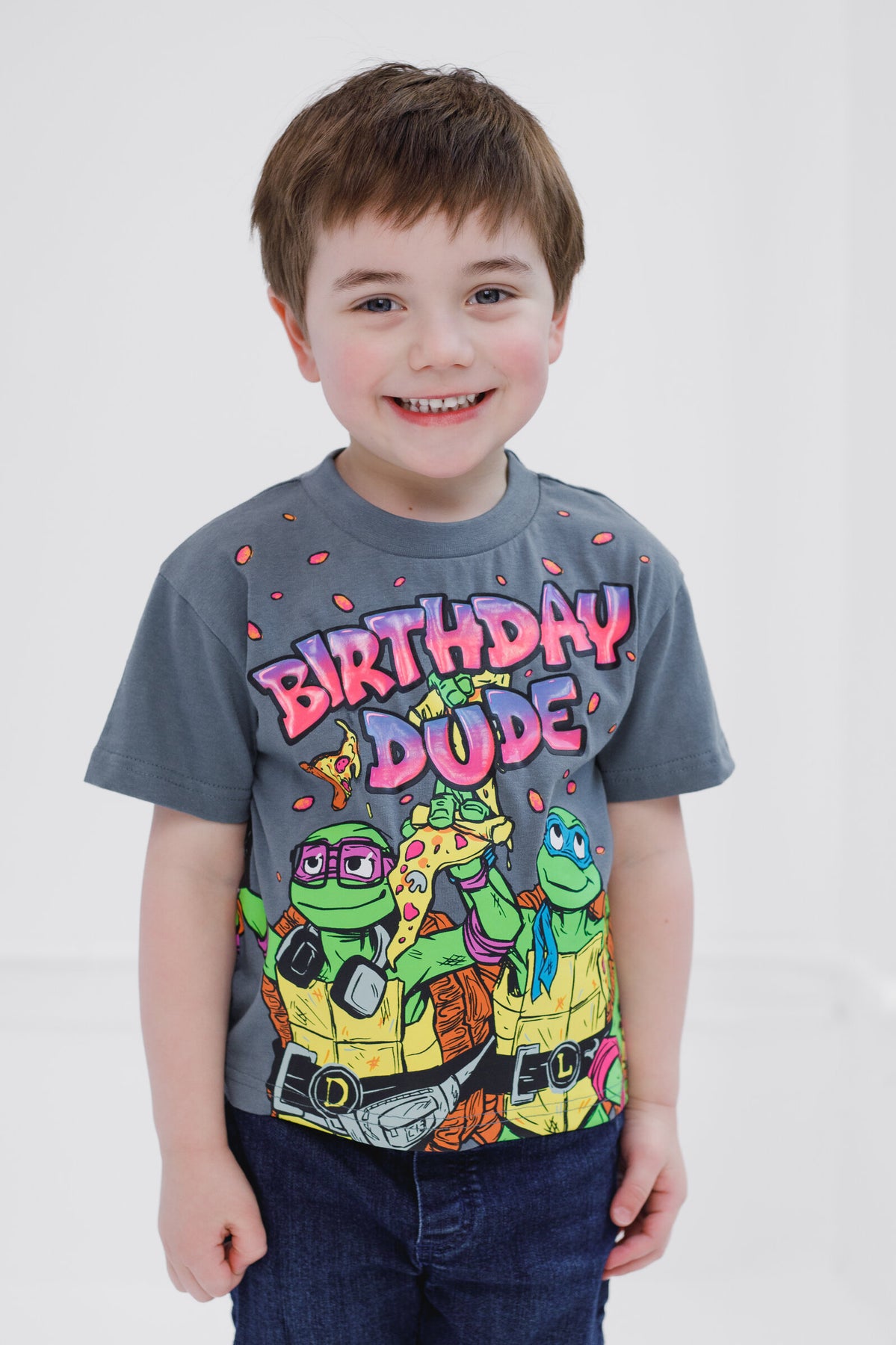 Celebrate your special day with Leo, Raph, Mike and Donnie in this stylish Teenage Mutant Ninja Turtles birthday shirt! This cute short sleeve tee features fun and vibrant artwork of your kid's favorite crime fighters eating pizza and the words "Birthday Dude" in a colorful glossy print! Dressed in this soft and comfy TMNT tshirt, your comic book fan is ready for an exciting birthday adventure!