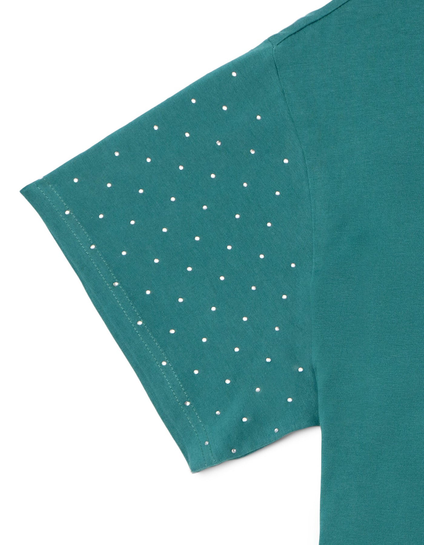 • Rib knit crew neck collar; Soft hand screen print design; Stylish drop shoulder sleeves; Pull on closure; Sparkly and shiny rhinestone artwork on sleeves; Boxy fit; Trendy cropped design