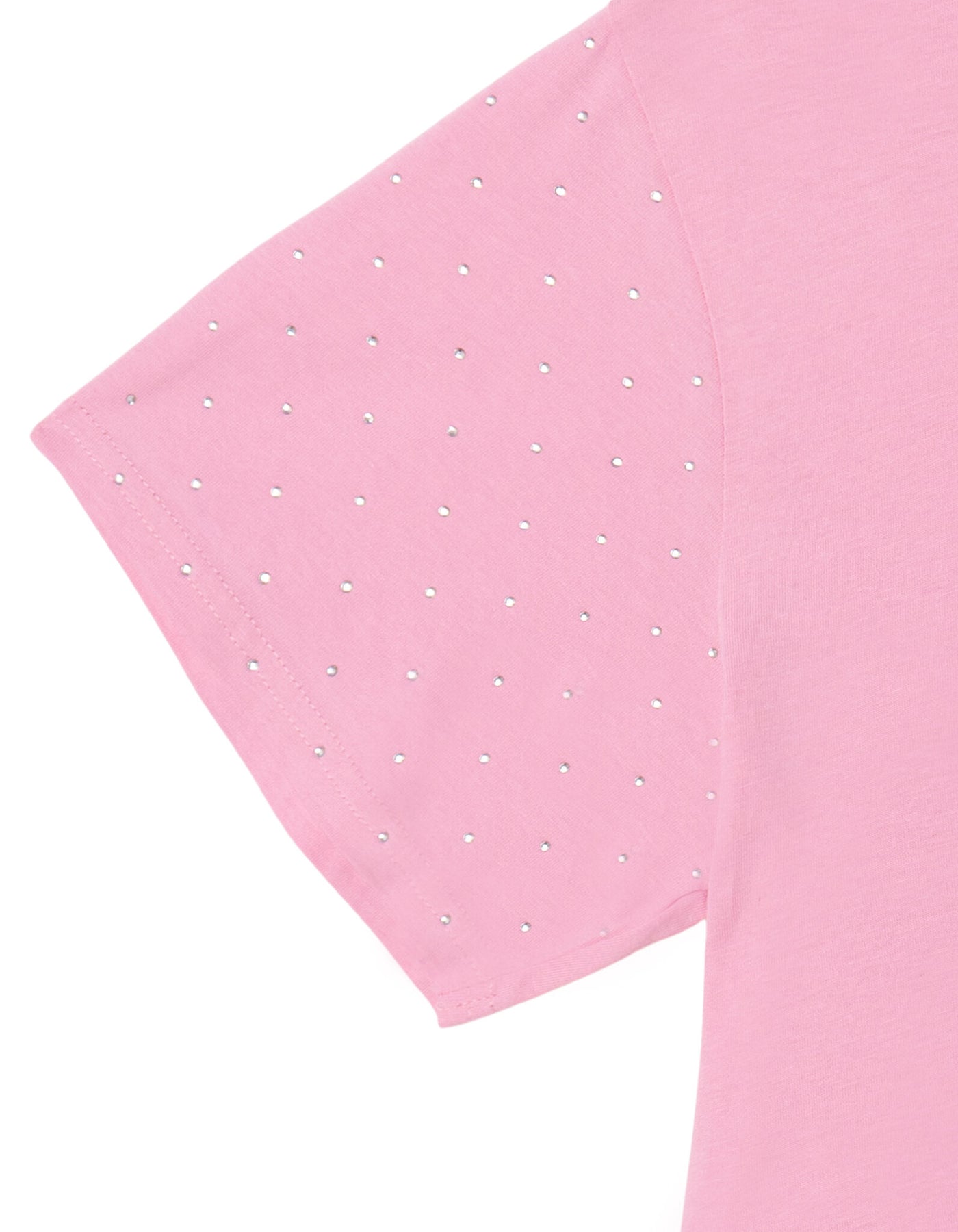 • Rib knit crew neck collar; Soft hand screen print design; Stylish drop shoulder sleeves; Pull on closure; Sparkly and shiny rhinestone artwork on sleeves; Boxy fit; Trendy cropped design