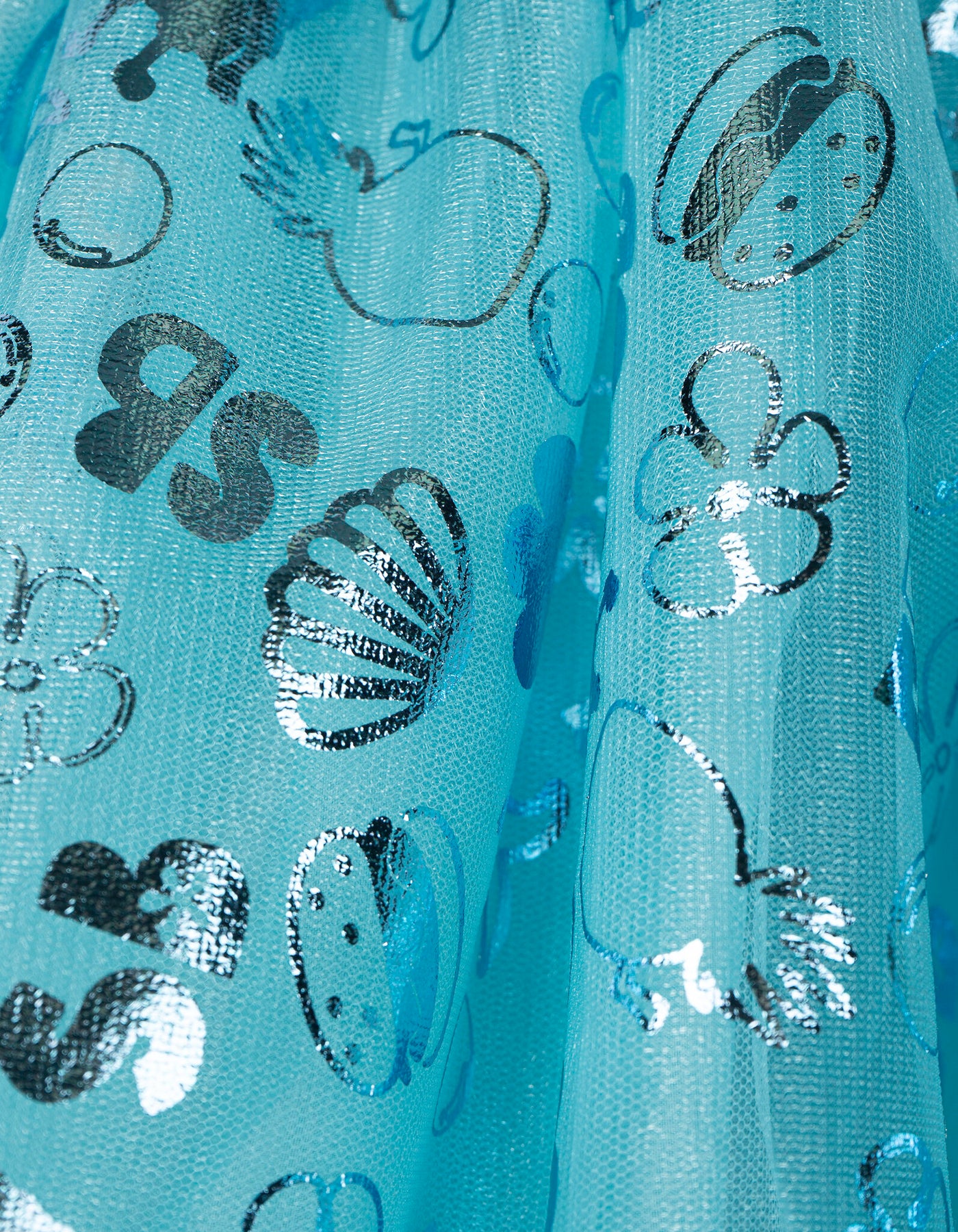 - All over print design; Tulle ballerina skirt; Dress-up cosplay design; Rib knit crew neck collar; Cute and stylish flutter sleeves; Soft hand screen print artwork on top and shiny foil art on skirt; Sparkly lurex elastic waistband; Pull on closure