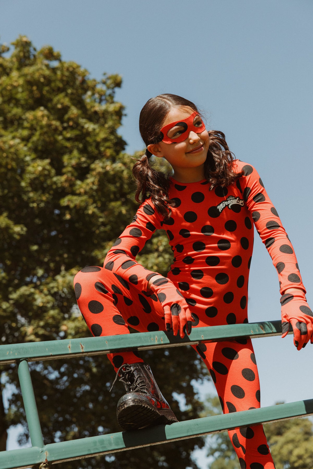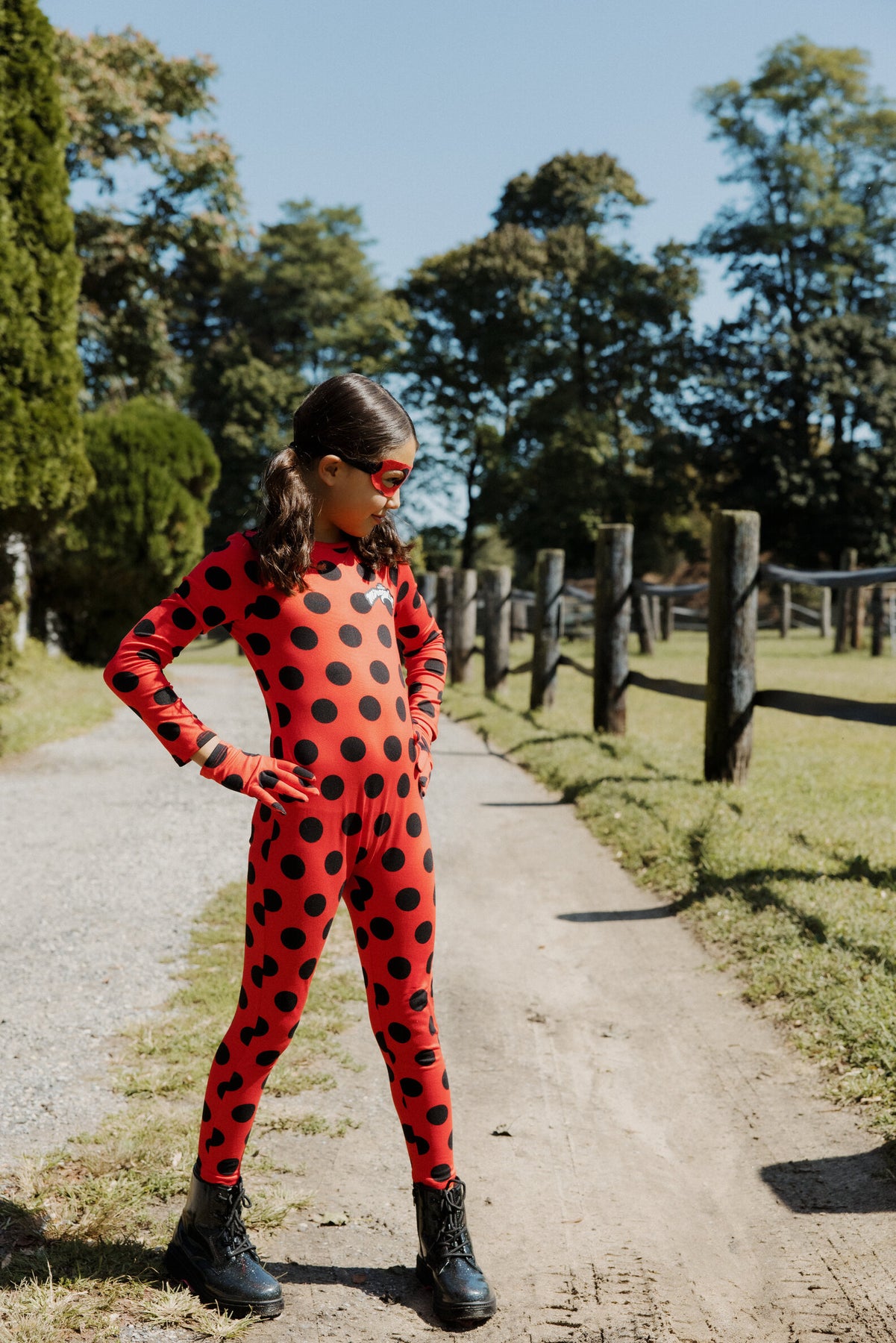 Unleash your playful side with this ladybug 3 piece costume set featuring a bold red and black polka-dotted jumpsuit. Complete the look with matching gloves and a charming mask to embody the iconic insect's mysterious charm. This ensemble is perfect for costume parties or playful dress-up occasions.