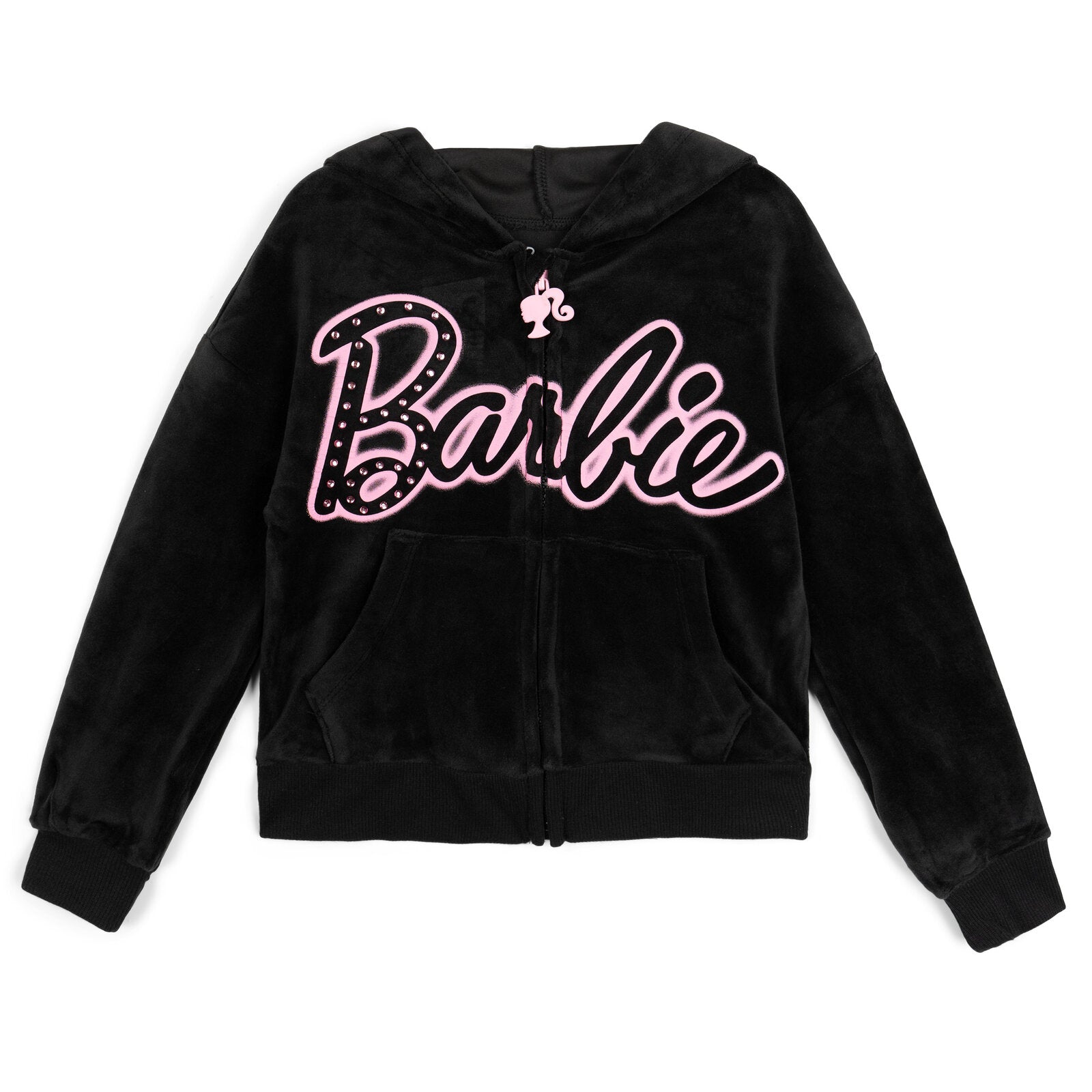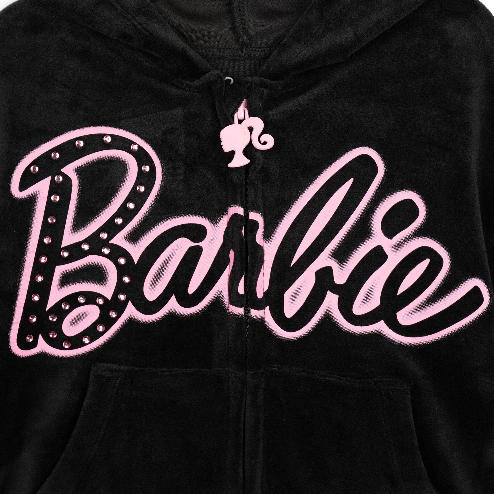 - Ribbed sleeve cuffs and waist for a better fit; Zip up front for easy dressing; Comfortable hood lining; Soft hand screen print design with sparkly and shiny rhinestone art; Stylish drop shoulder sleeves; Elastic waist for comfortable stretch and fit; Wide leg flare; Comfy and warm front kangaroo pocket; Soft velour for a stylish and comfy look; Embossed velour; Novelty character zipper pull