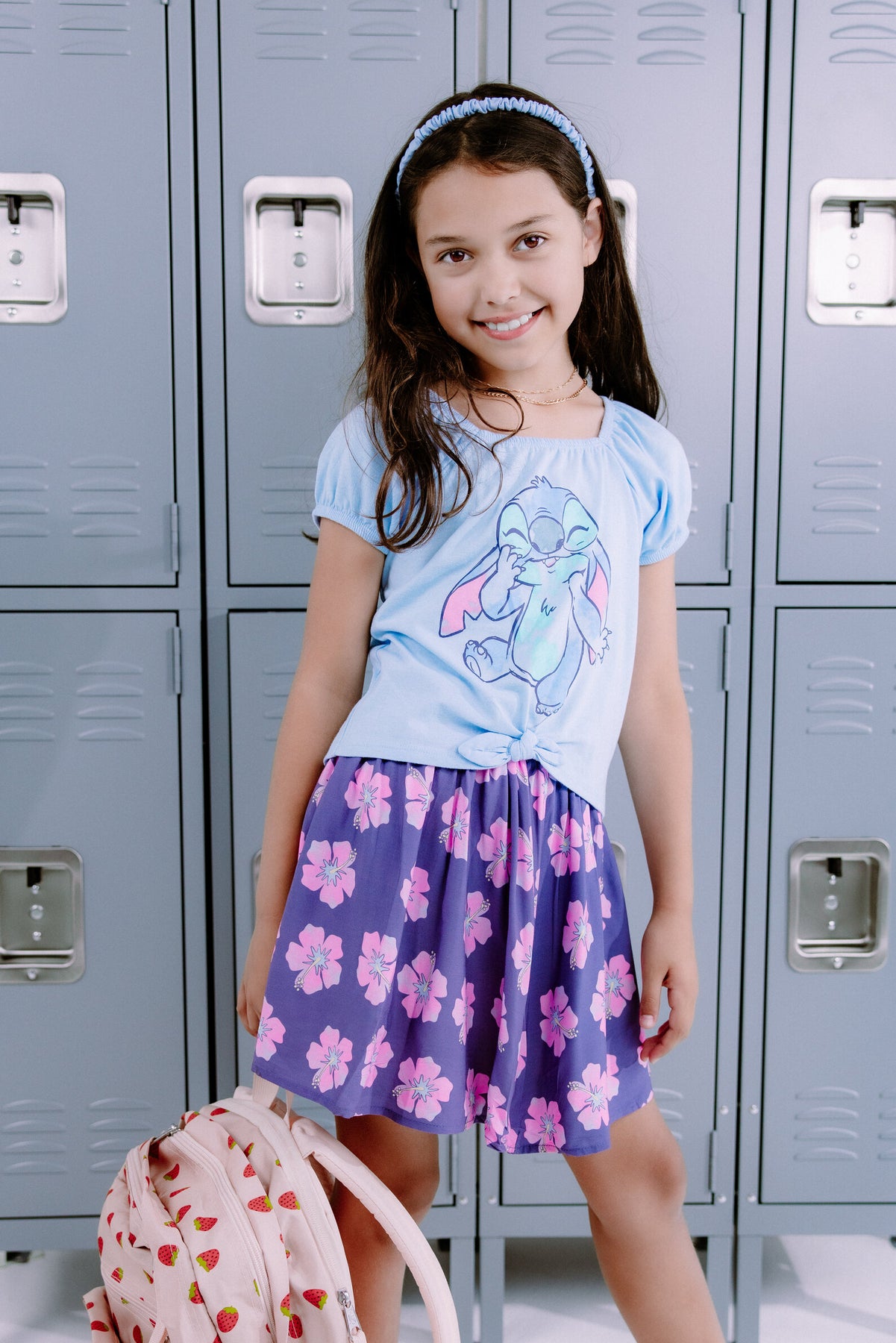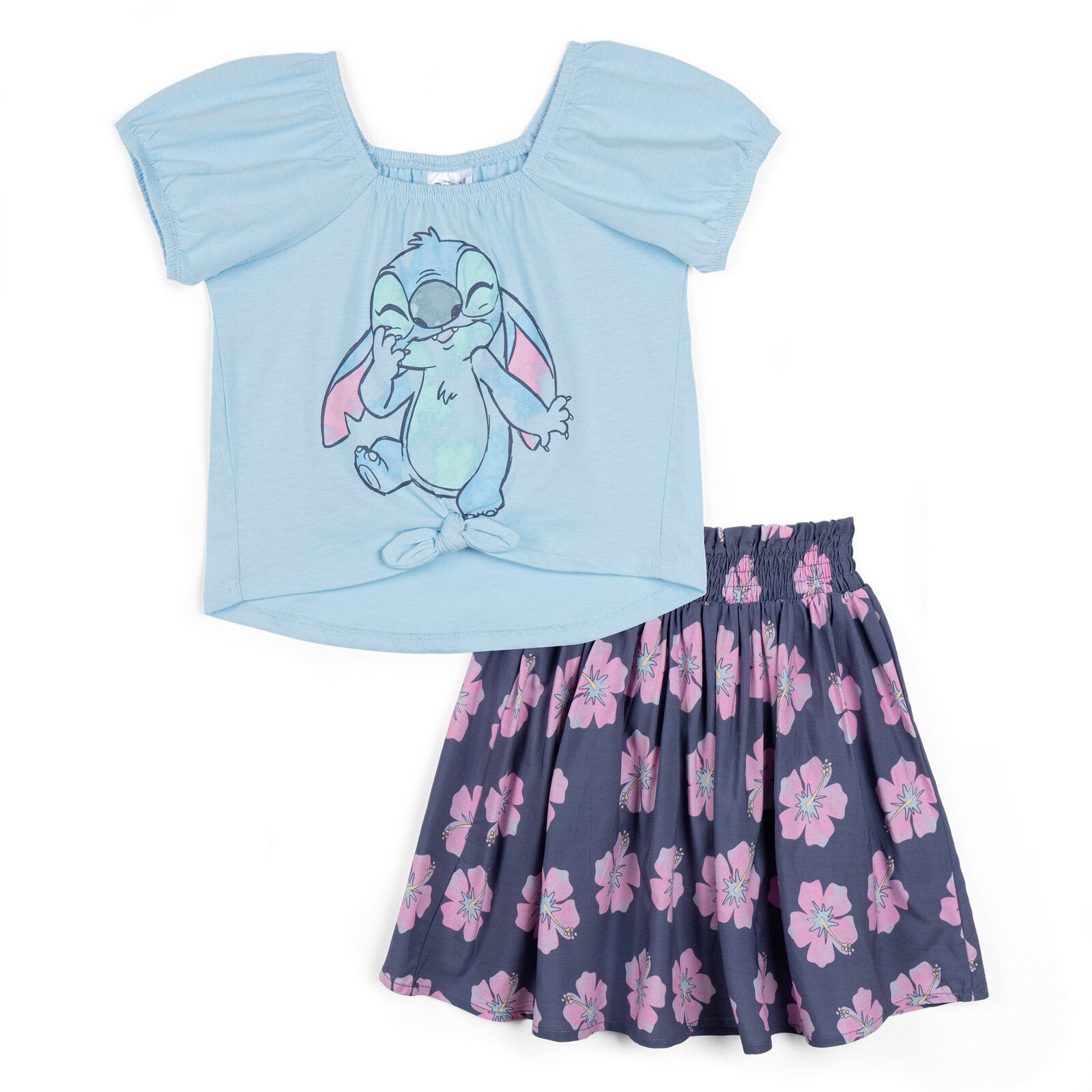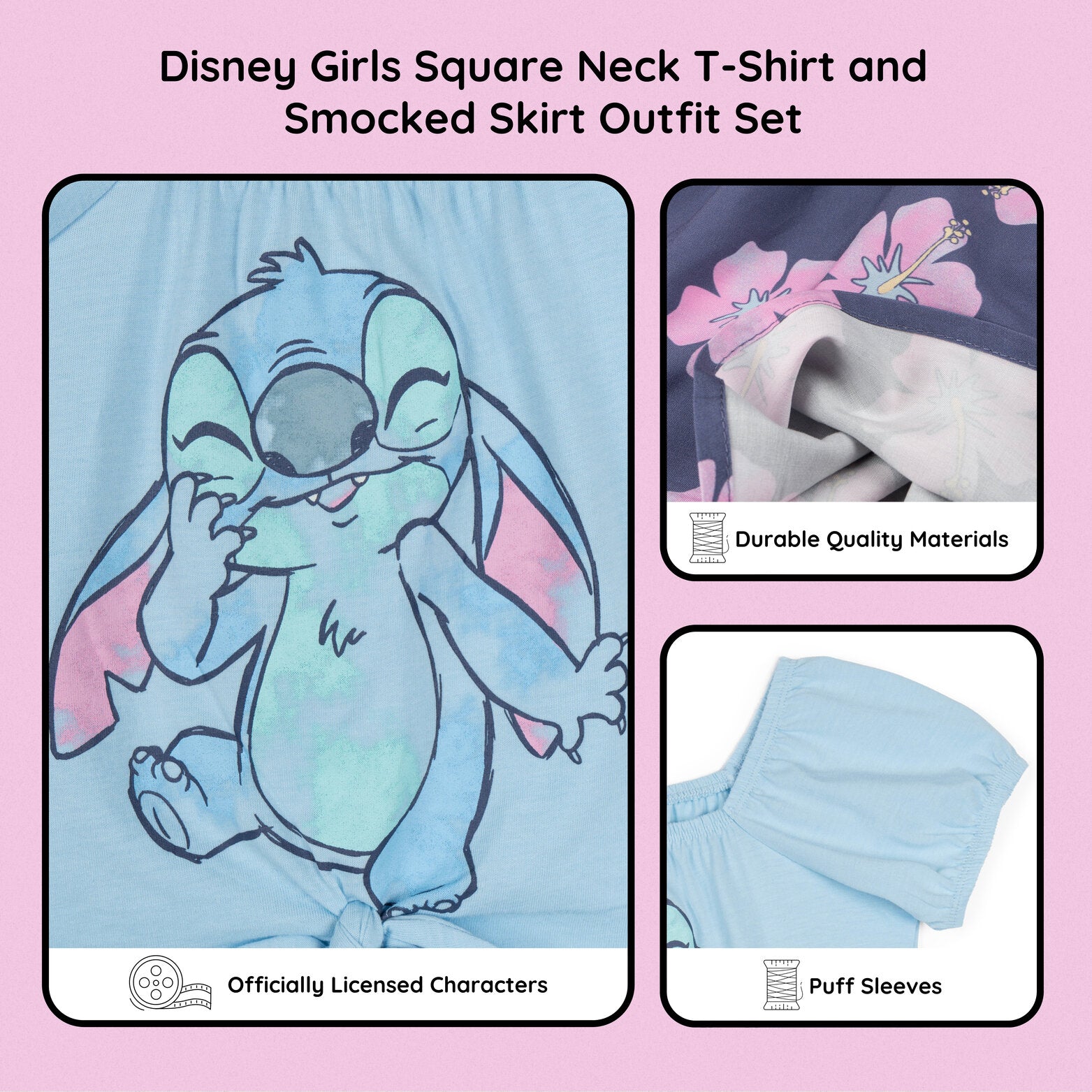 Get your little one ready for a day of fun with this adorable Disney Lilo and Stitch outfit set! The square neck t-shirt and smocked skirt are perfect for any occasion, from playdates to family outings. Made for toddlers to big kids, this set features vibrant artwork of Stitch and a cute floral design. Your child will love the comfortable fit and you'll love the easy care fabric. Add a touch of Disney magic to your child's wardrobe with this must-have outfit set!