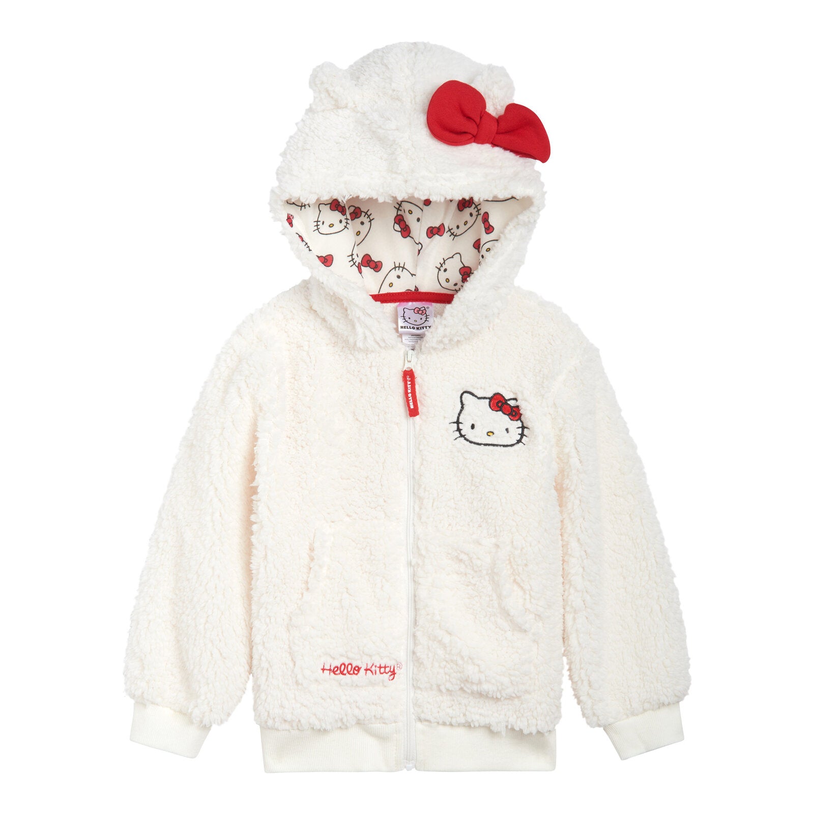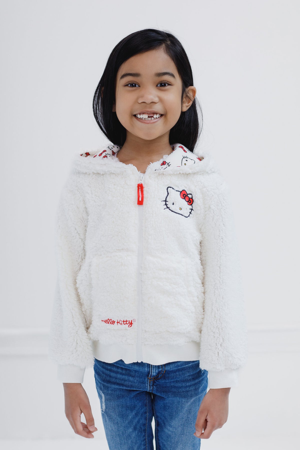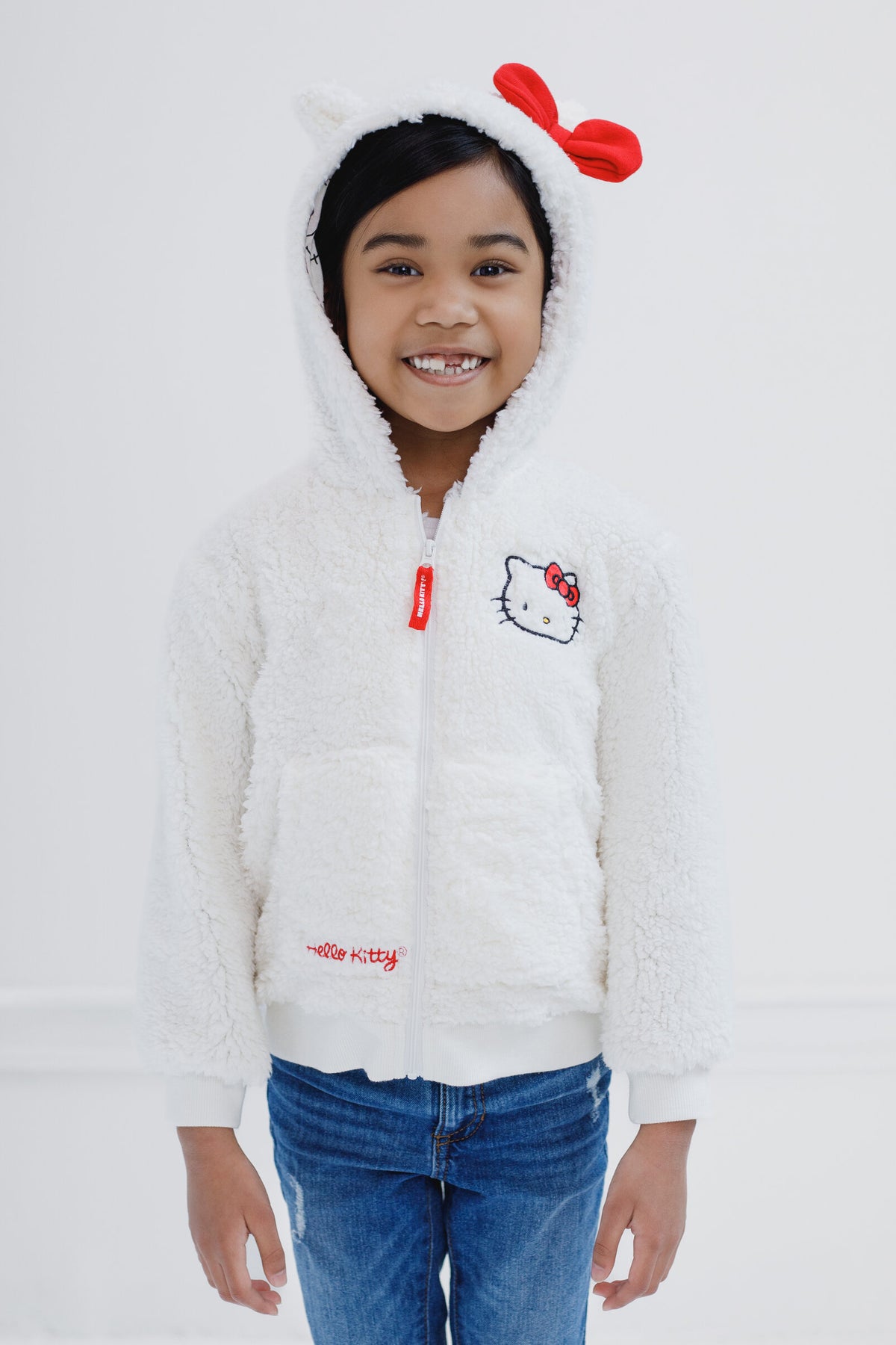 Your Hello Kitty fan is ready for a fun day with her favorite cartoon cat in this cute Hello Kitty hoodie! This cool long sleeve hooded sweatshirt features a cool Hello Kitty printed inner lining, cosplay cat ears and 3D bow on the hood, and vibrant embroidered artwork of Hello Kitty that your little girl will love to wear! Made of a soft Faux Sherling material that keeps your child cozy and comfortable, this stylish Hello Kitty zip-up hoodie is part of the perfect outfit for all day adventure and play!