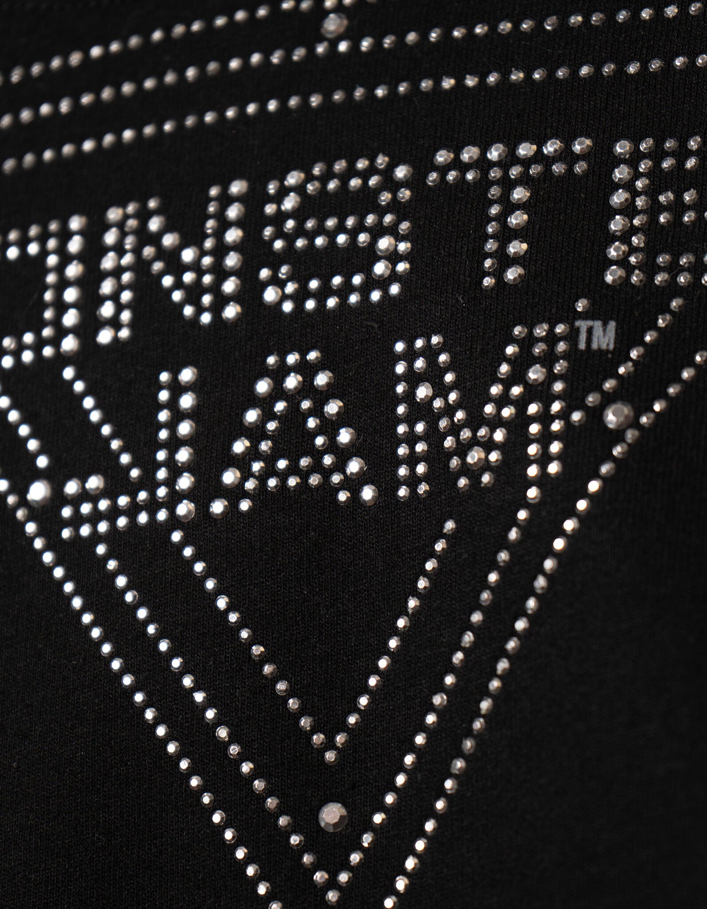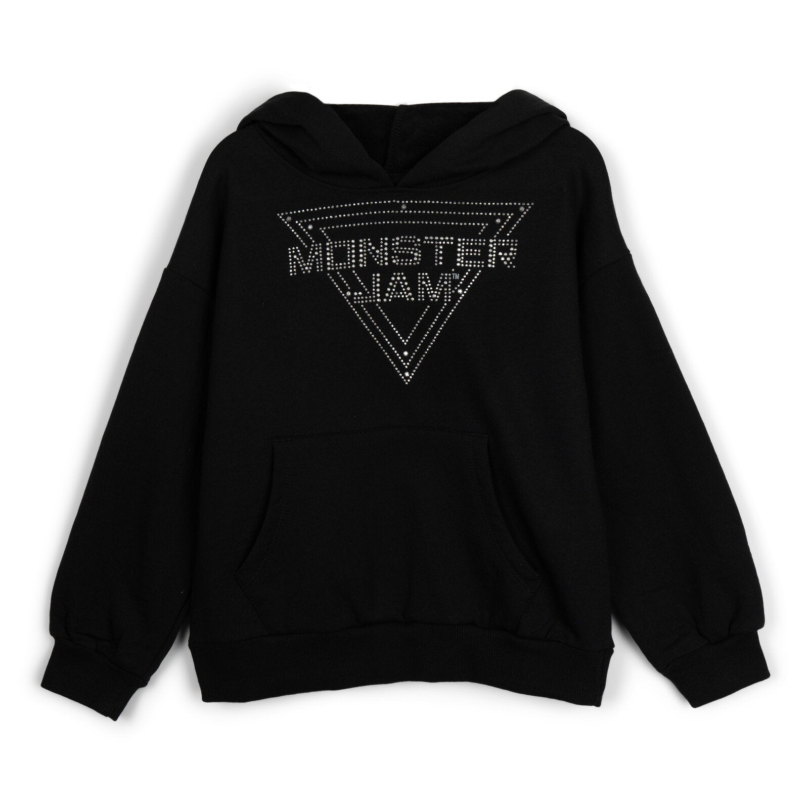 • Pull on closure; Ribbed sleeve cuffs and waist for a better fit; Stylish drop shoulder sleeves; Comfortable and warm front kangaroo pocket; Sparkly and shiny rhinestone artwork