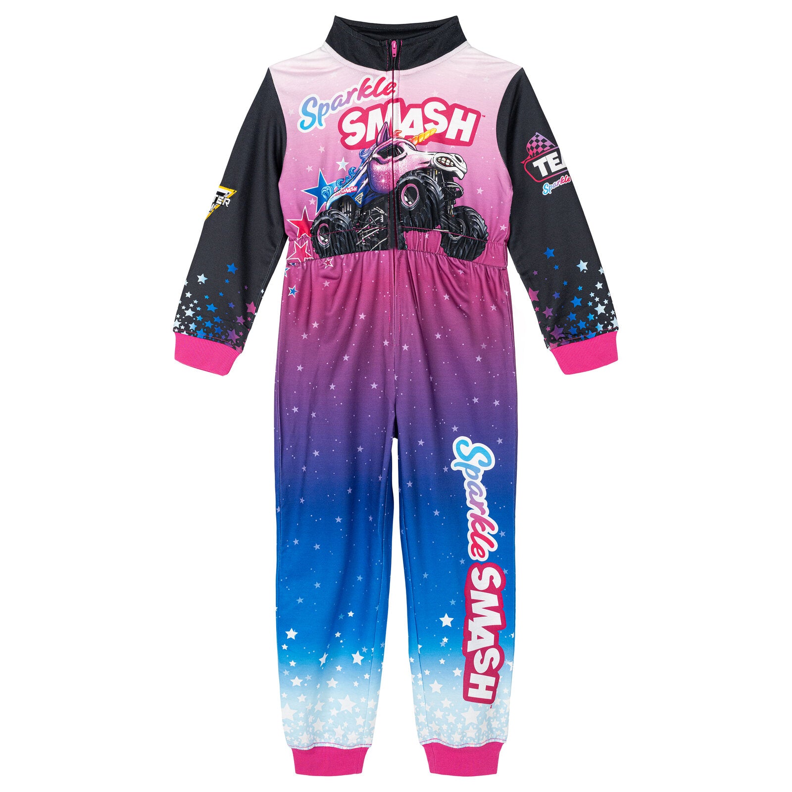 - Officially licensed Monster Jam Sparkle Smash toddler girls long sleeve one-piece coverall