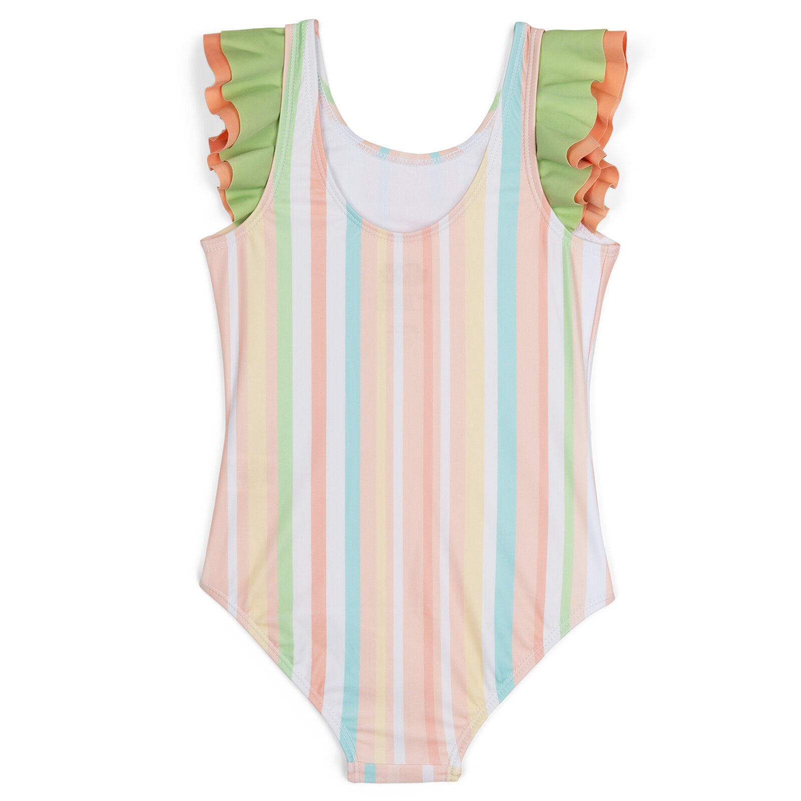 - All over print design; Crew neck collar; Cute and stylish flutter sleeves; Awesome sublimation print artwork; UPF 50+ material for excellent UVB and UVA sun protection and worry-free sun time; 4 way stretch fabric for comfort and long-lasting fit; Pull on closure; Stripe pattern design