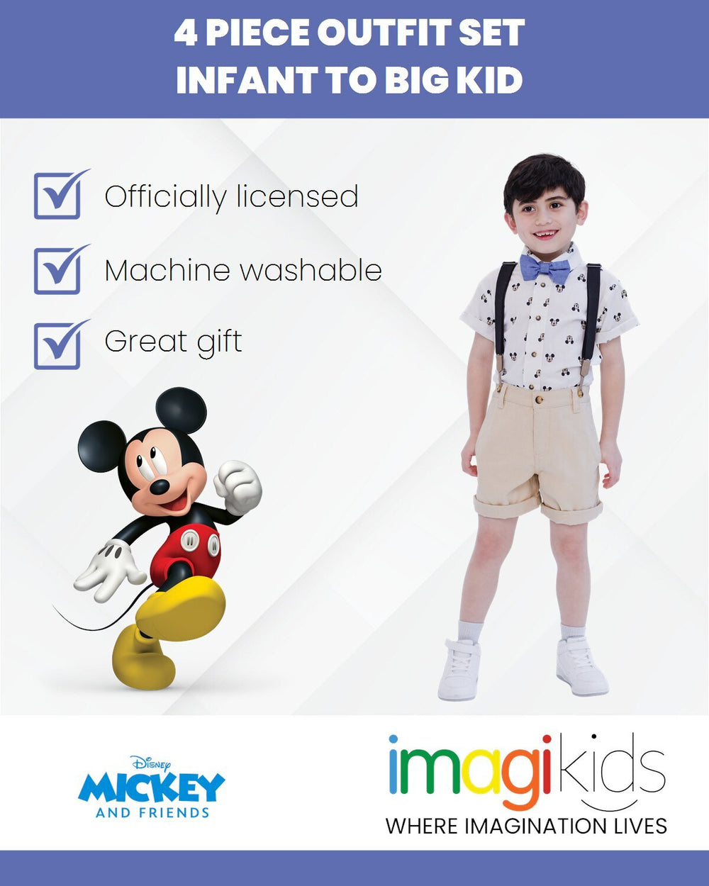 Disney Mickey Mouse Button Down Shirt Twill Shorts Suspenders and Bow-Tie 4 Piece Outfit Set