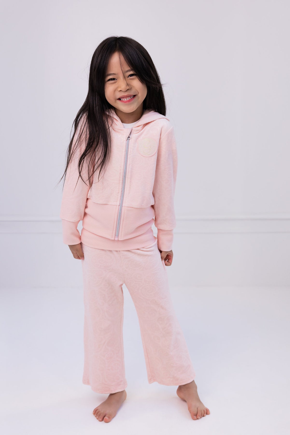 • Ribbed sleeve cuffs and waist for a better fit; Zip up front for easy dressing; Comfortable hood lining; Soft hand screen print design; Embroidered applique patch; Elastic waist for comfortable stretch and fit; Paisley; Wide leg flare; Soft velour for a stylish and comfy look; Embossed velour art; Fold over waist