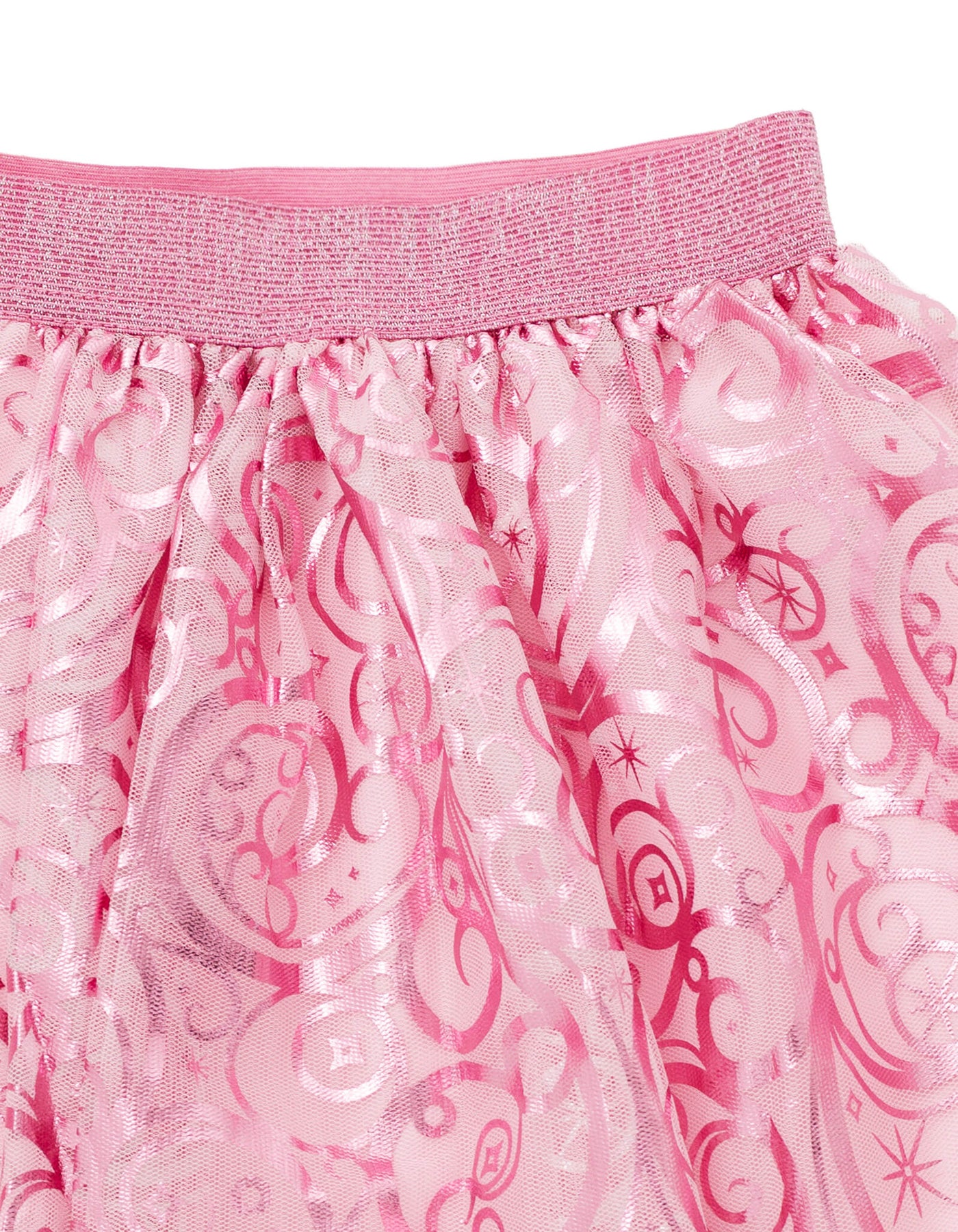 • All over print design; Rib knit crew neck collar; Soft hand screen print artwork; Sparkly lurex elastic waistband; Layered ballerina tulle skirt with taffeta lining and shiny foil art; Elastic waist for comfortable stretch and a better fit; Pull on closure