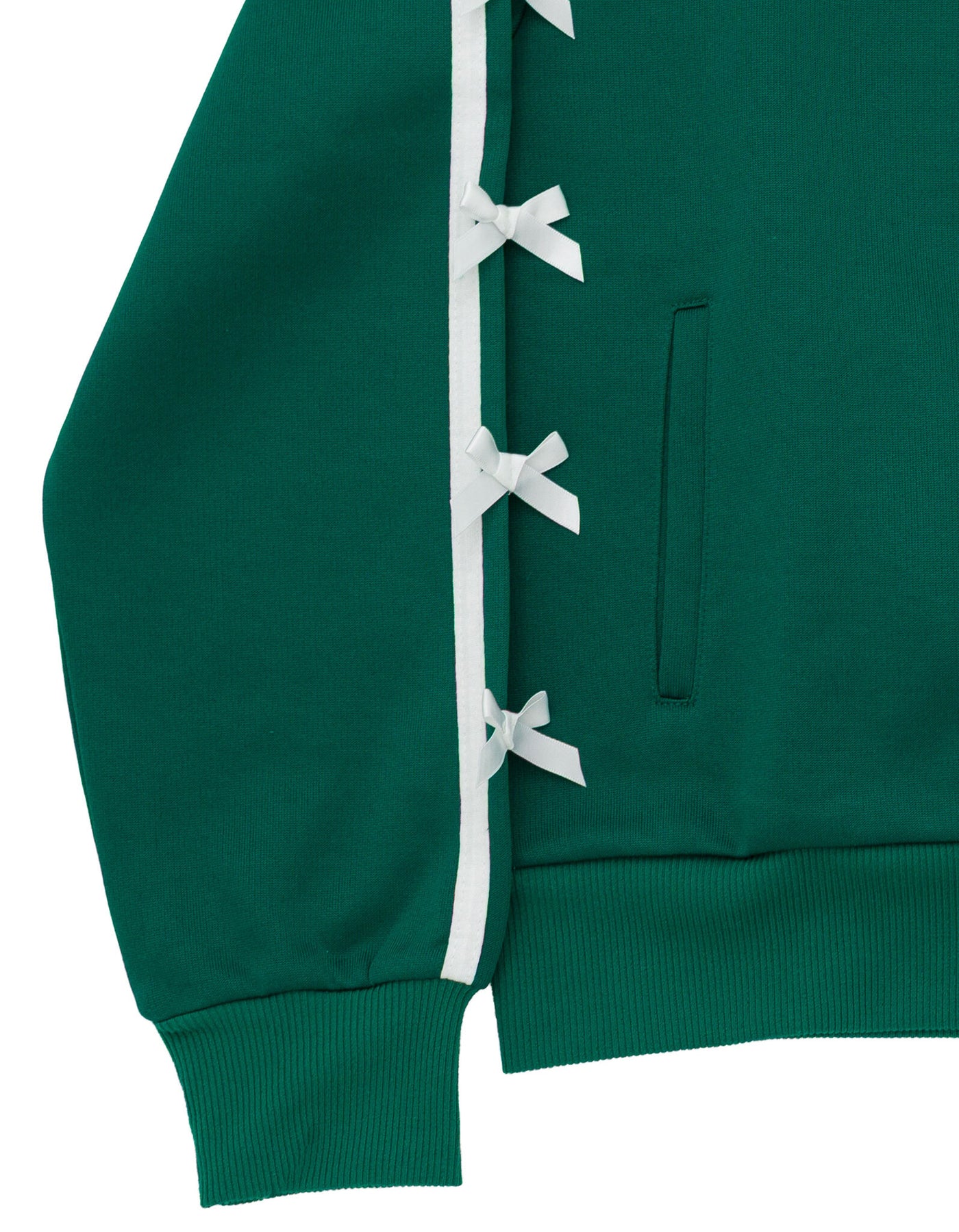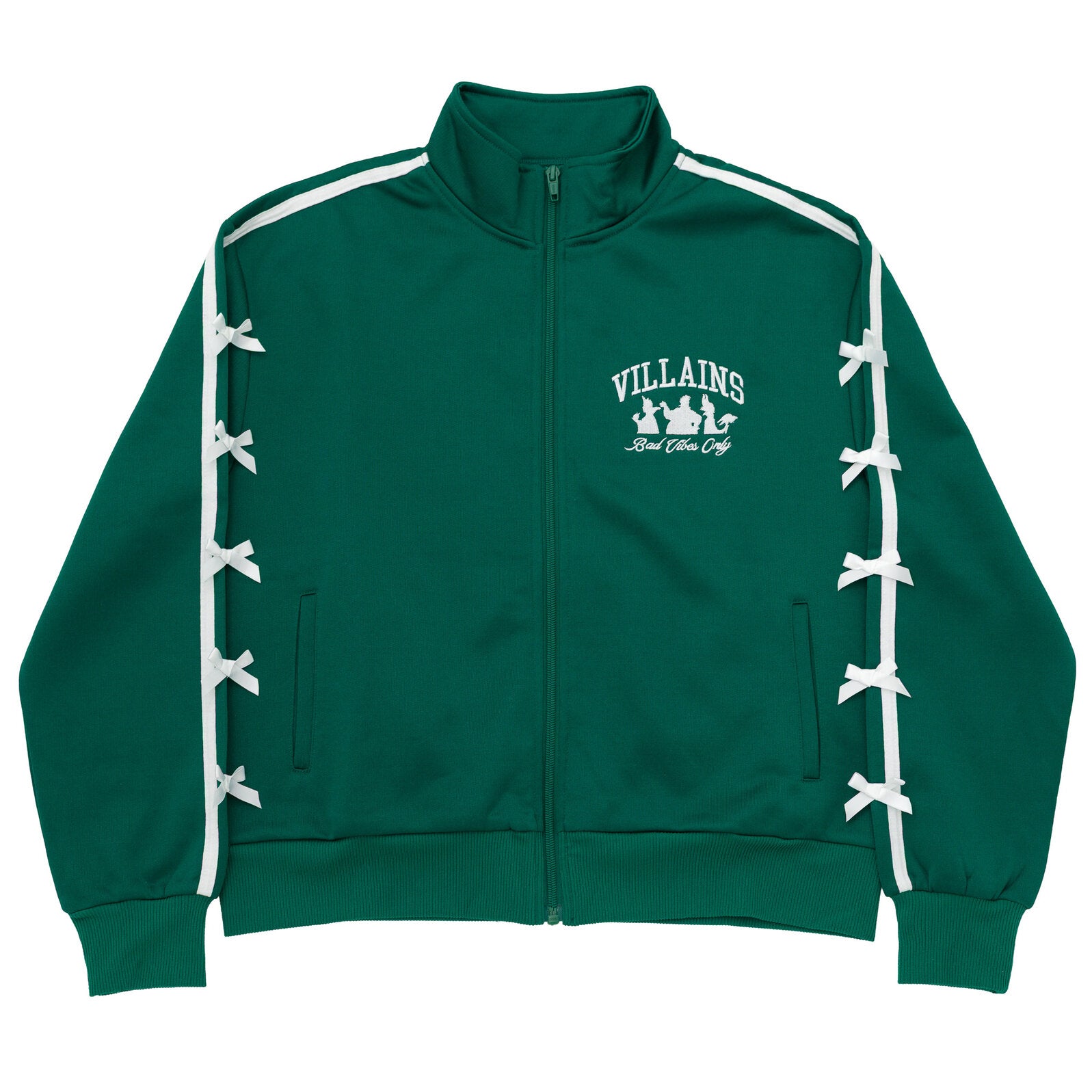 • Cute track jacket for a fashionable and functional look; Ribbed sleeve cuffs and waist for a better fit; Zip up front for easy dressing; Soft hand screen print design; Functional pockets; Cozy mock neck style; Contrast side stripe with 3D satin ribbon bows; Front and back graphic