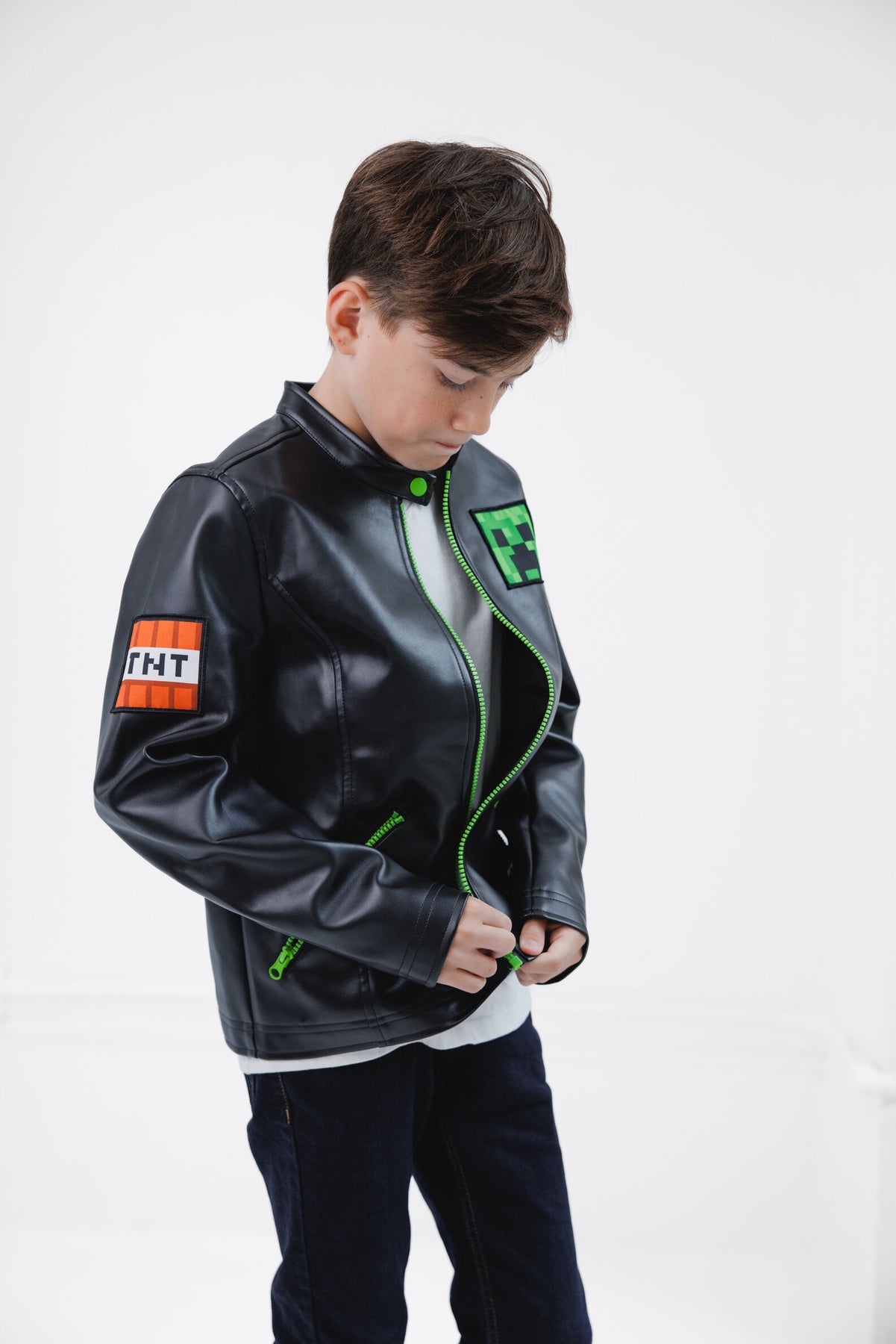 Get your little one ready for their next adventure with this Minecraft Creeper faux leather jacket. Made with high-quality materials, this jacket is both stylish and durable. The iconic Creeper design is sure to please any Minecraft fan. Available in sizes for both little and big kids, this jacket is perfect for any occasion. Whether they're exploring the blocky world of Minecraft or just playing outside, your child will stay warm and comfortable in this jacket. Don't miss out on this must-have piece for any young gamer.
