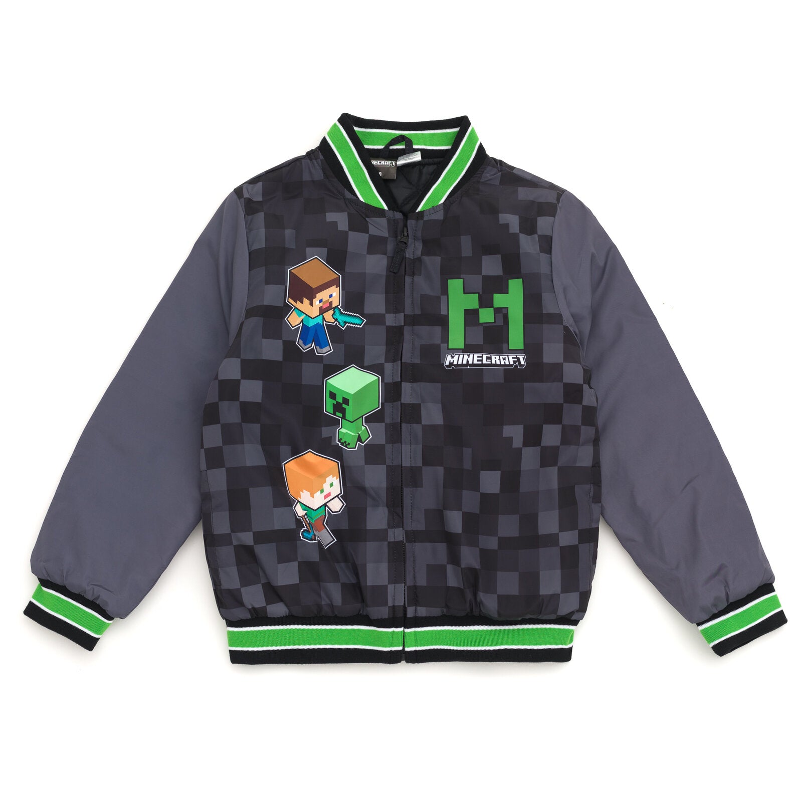 Get your little gamer ready for adventure with this Minecraft Varsity Bomber Jacket. Made for little kids to big kids, this jacket features a bold design with the iconic Creeper, Steve, and Alex characters. The varsity style adds a cool touch, while the bomber jacket silhouette keeps them warm and stylish. Perfect for any Minecraft fan, this letterman jacket is made with high-quality materials for durability and comfort. Let your child show off their love for Minecraft in style with this must-have jacket. Available in a range of sizes, it's the perfect addition to any young gamer's wardrobe.