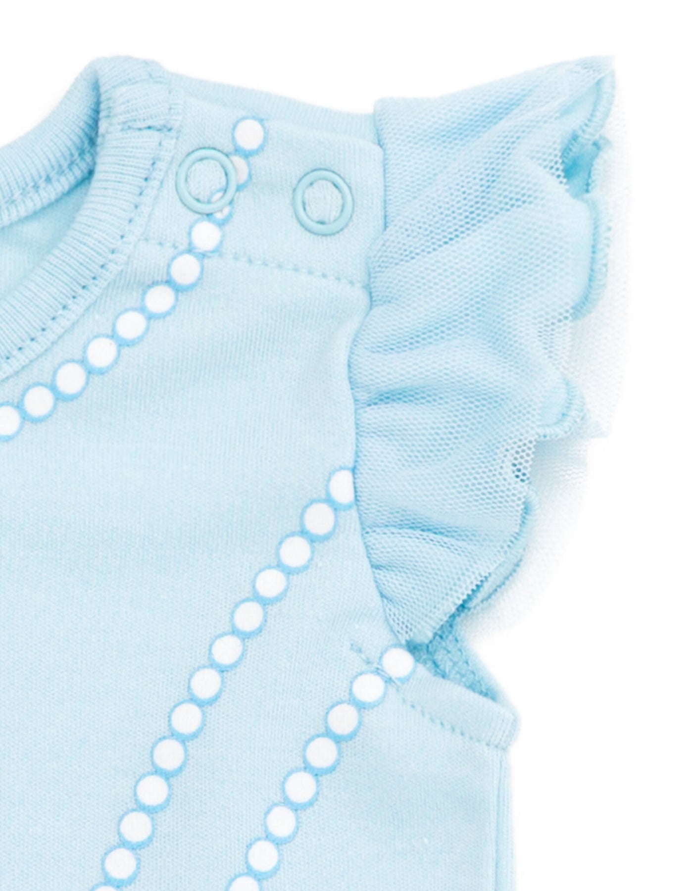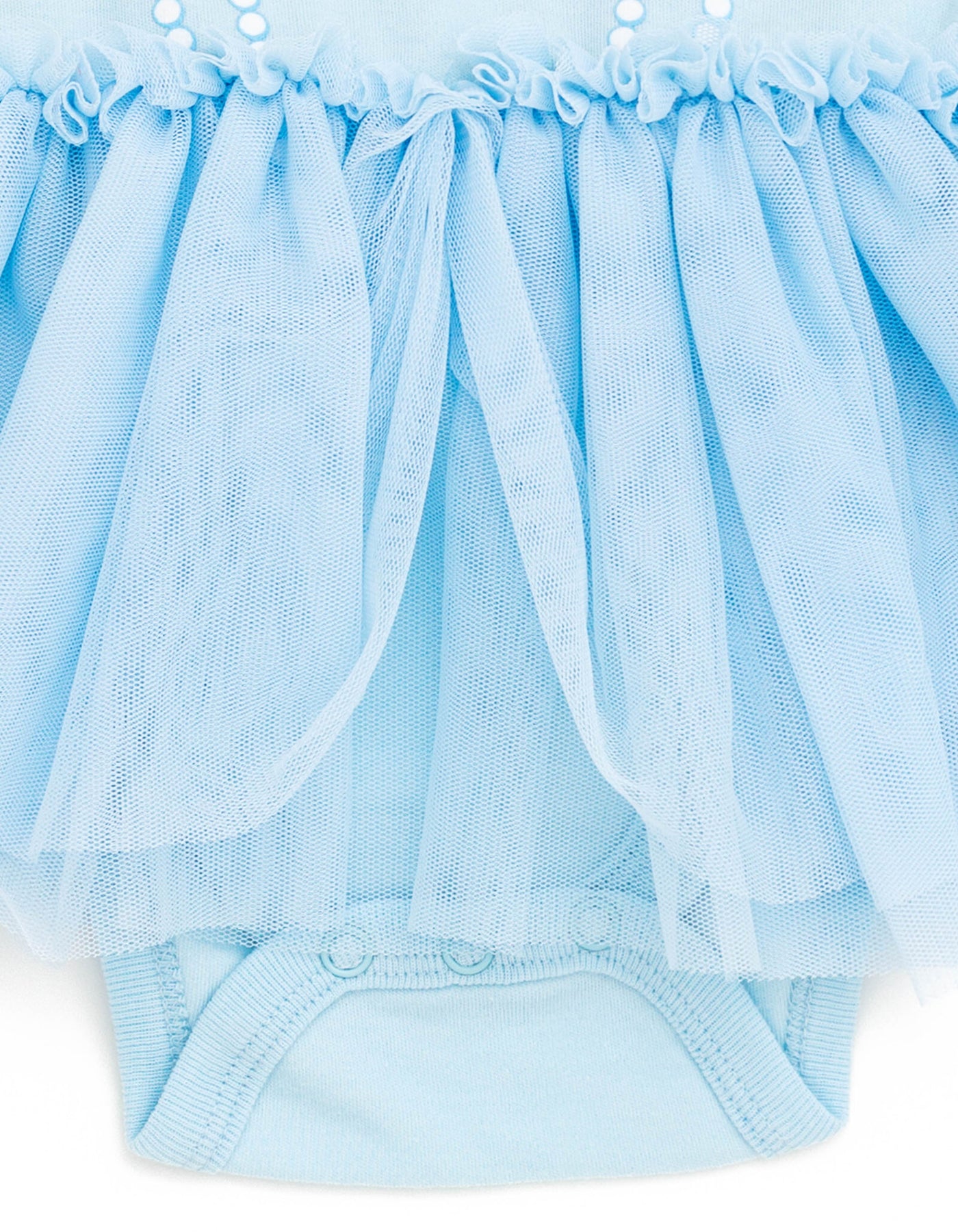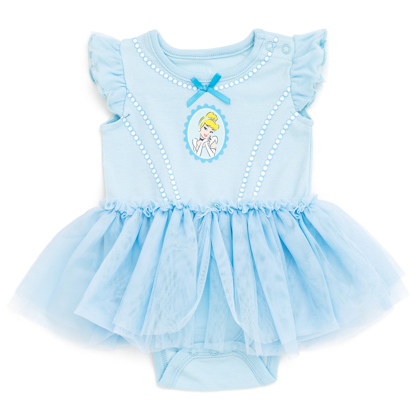 • Bodysuit with rib knit binding; 3-snap closure for quick and easy diaper changes; Dress-up cosplay design; Rib knit crew neck collar with satin bow; Awesome screen print design with glitter; Cute and stylish flutter sleeves with mesh sleeves overlay; 2 snaps by shoulder for easy dressing; Skirt overlay for a cute and stylish look; Matching elastic headband with fashion bow