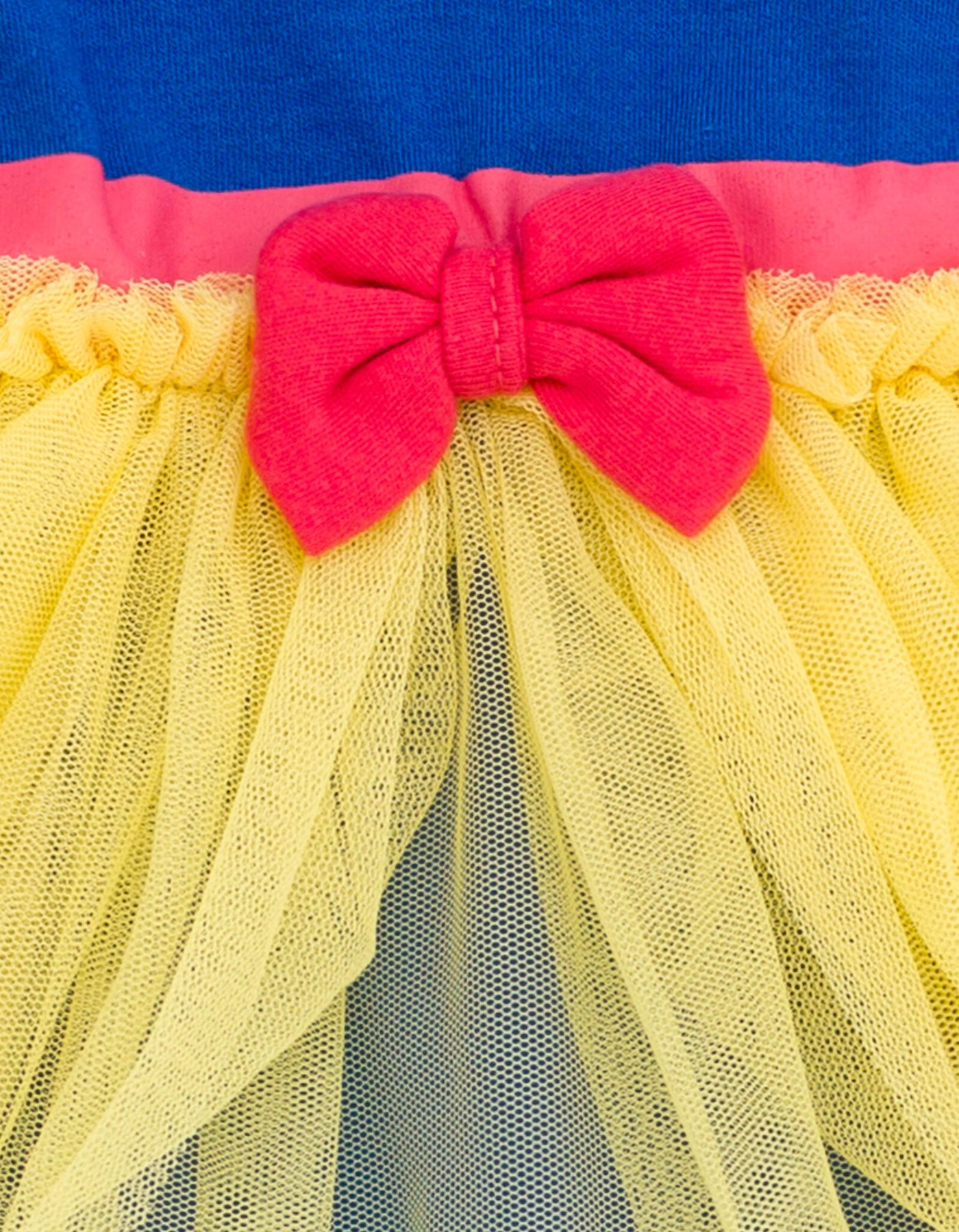 • Bodysuit with rib knit binding; 3-snap closure for quick and easy diaper changes; Dress-up cosplay design; Rib knit crew neck collar; Awesome screen print design with glitter; Cute and stylish flutter sleeves; 2 snaps by shoulder for easy dressing; Skirt overlay for a cute and stylish look; 3D bow at waist; Matching elastic headband with fashion bow