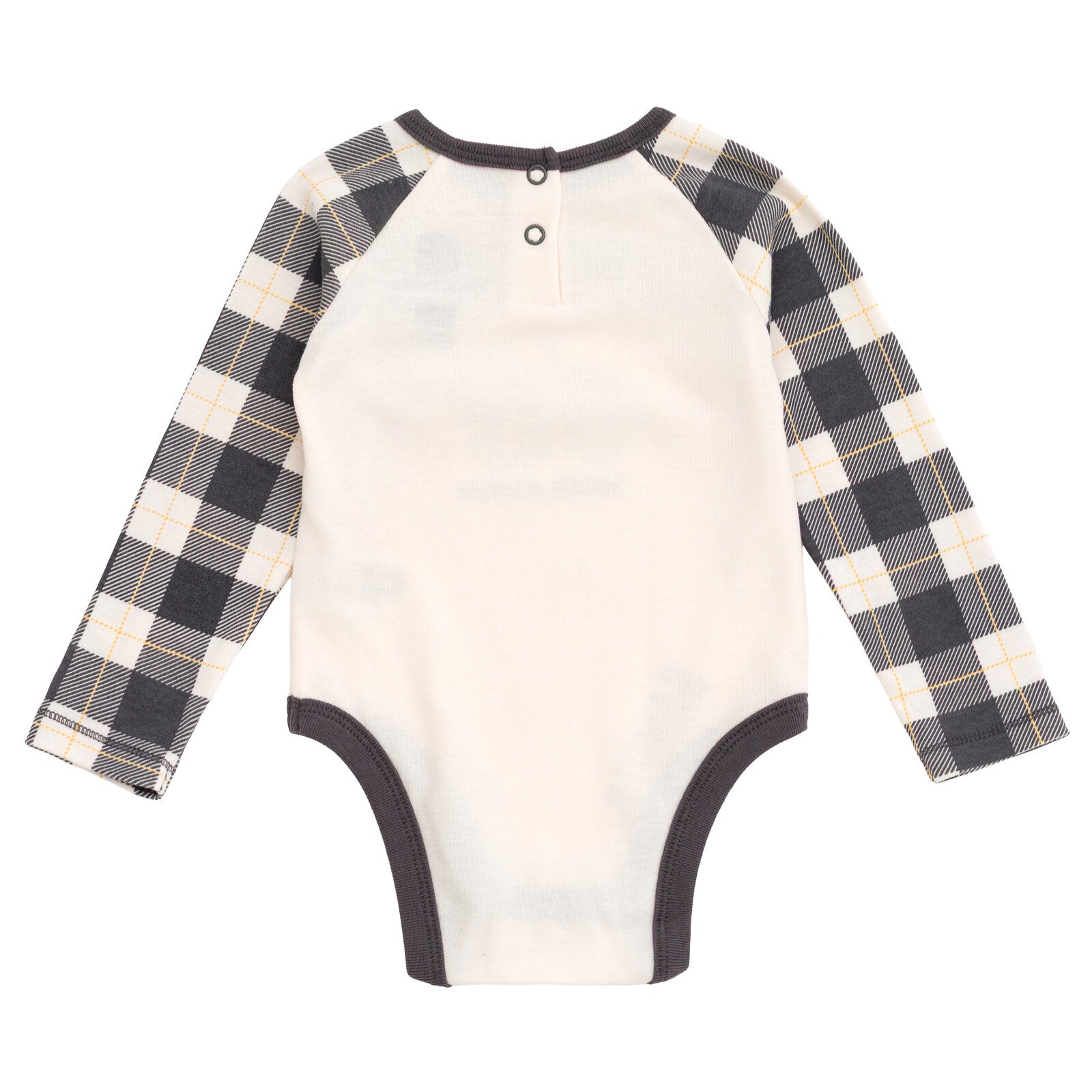 • Bodysuit with rib knit binding; All over print design; Lap shoulders or back snaps for easy dressing; Contrast raglan sleeves; 3-snap closure for quick and easy diaper changes; Rib knit crew neck collar; Awesome screen print artwork with screen printed applique; Stylish plaid or stripe pattern design; Woven label