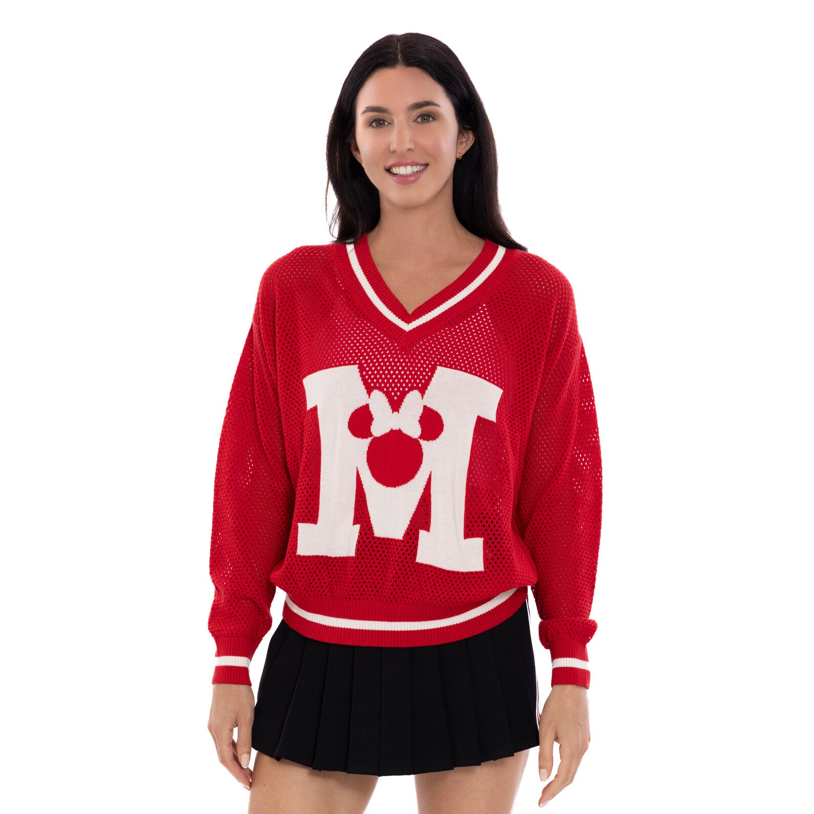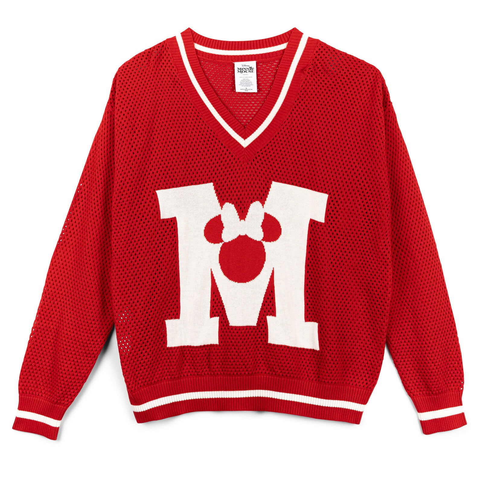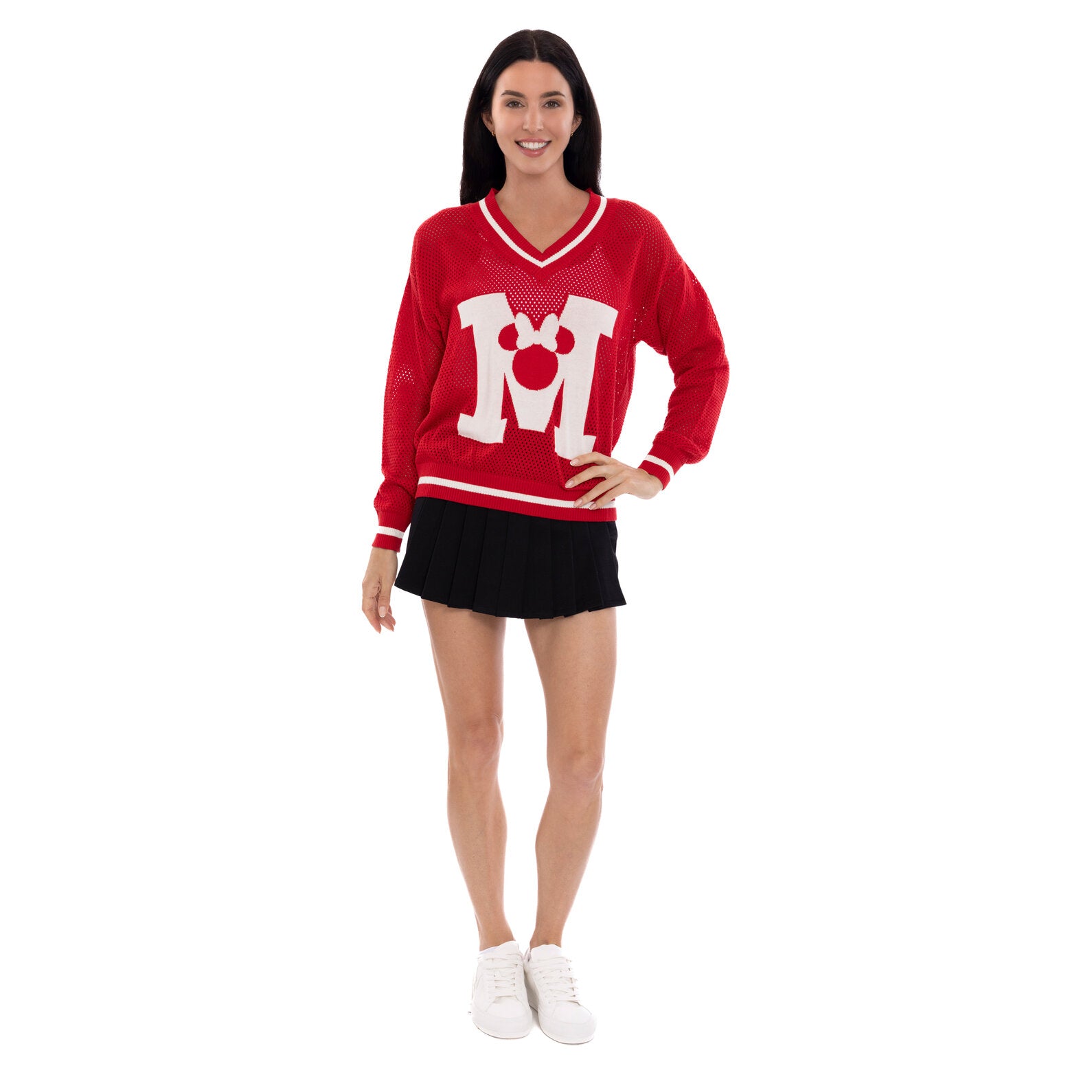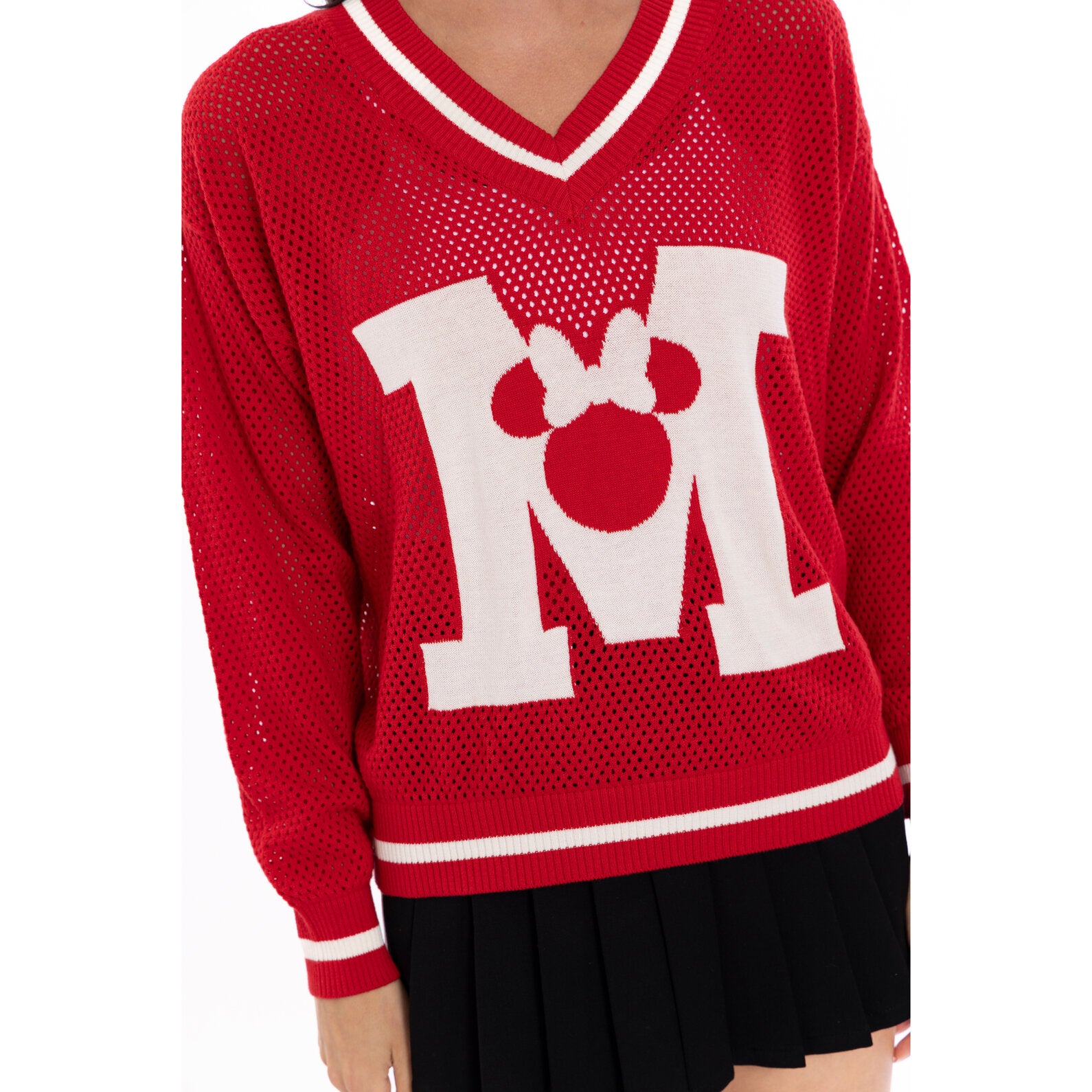 Disney Minnie Mouse Crochet Varsity V-neck Pullover Long Sleeve Sweater Adult