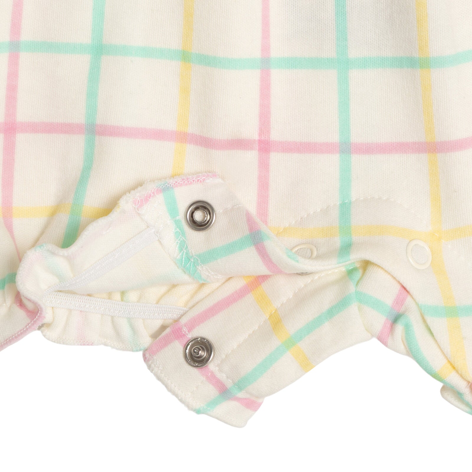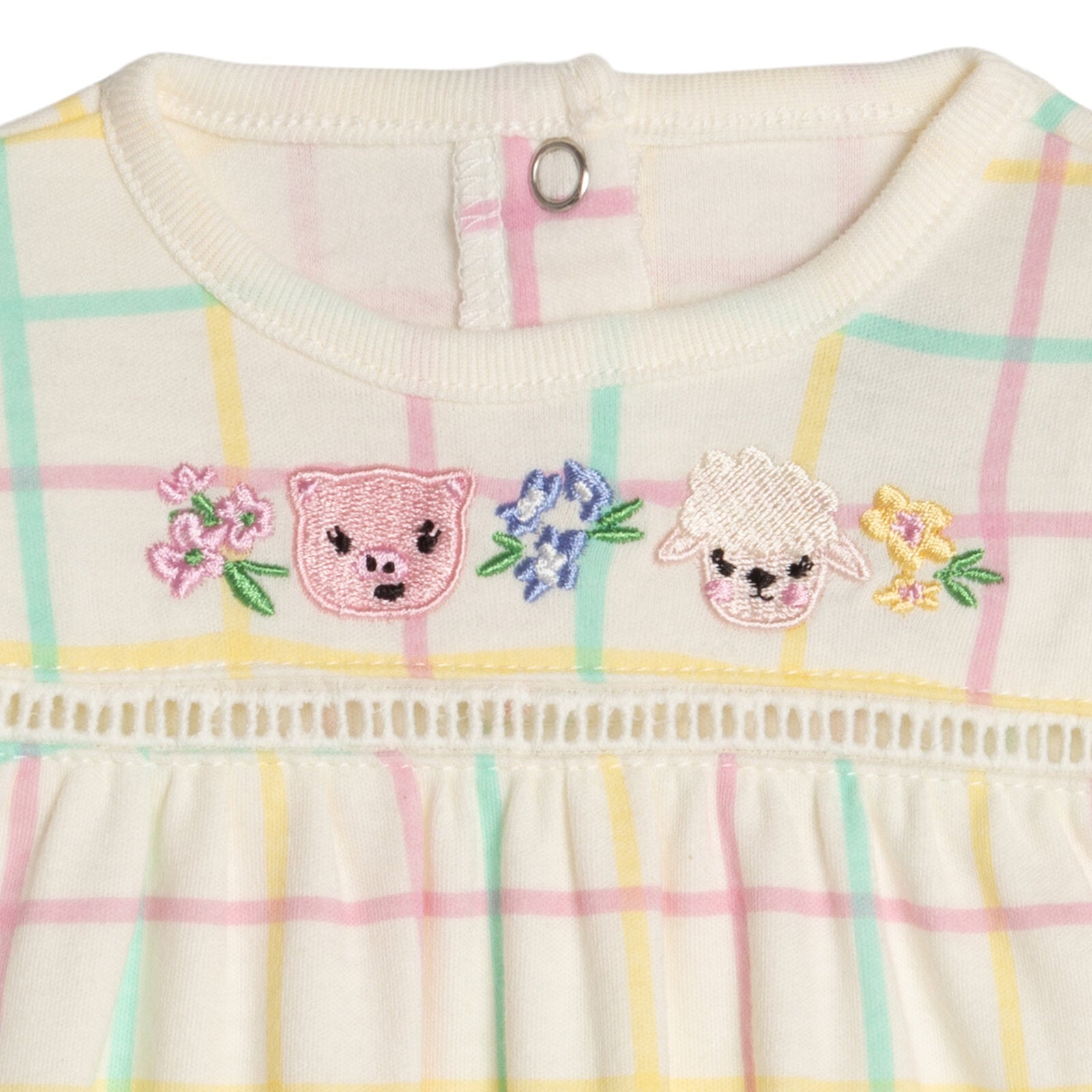 - Rib knit crew neck collar; Cute and stylish flutter sleeves; Soft hand screen print artwork; Elastic leg cuff openings for a comfortable fit; Colorful plaid style; Awesome embroidery art; Snap closure down back of garment for easy dressing